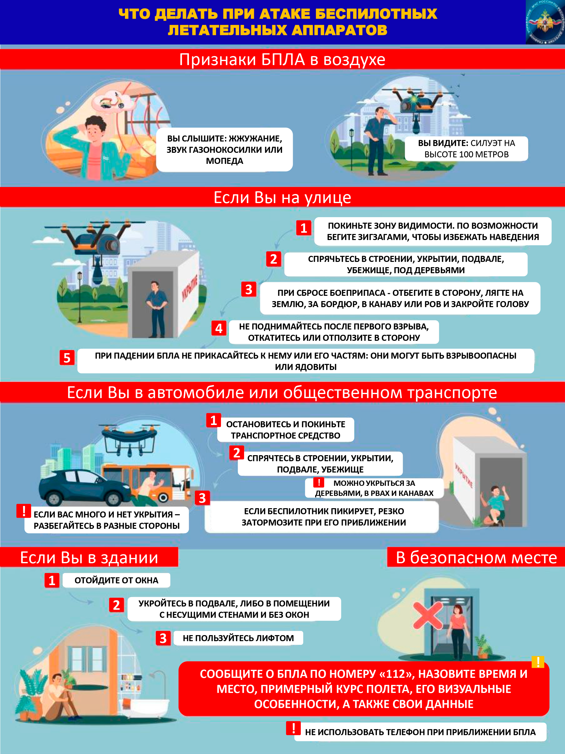 Если в момент нападения беспилотных летательных аппаратов (БПЛА) люди находятся в здании, специалисты рекомендуют им по возможности спуститься на самые нижние этажи, в подвал и паркинг. Пользоваться лифтом нельзя!