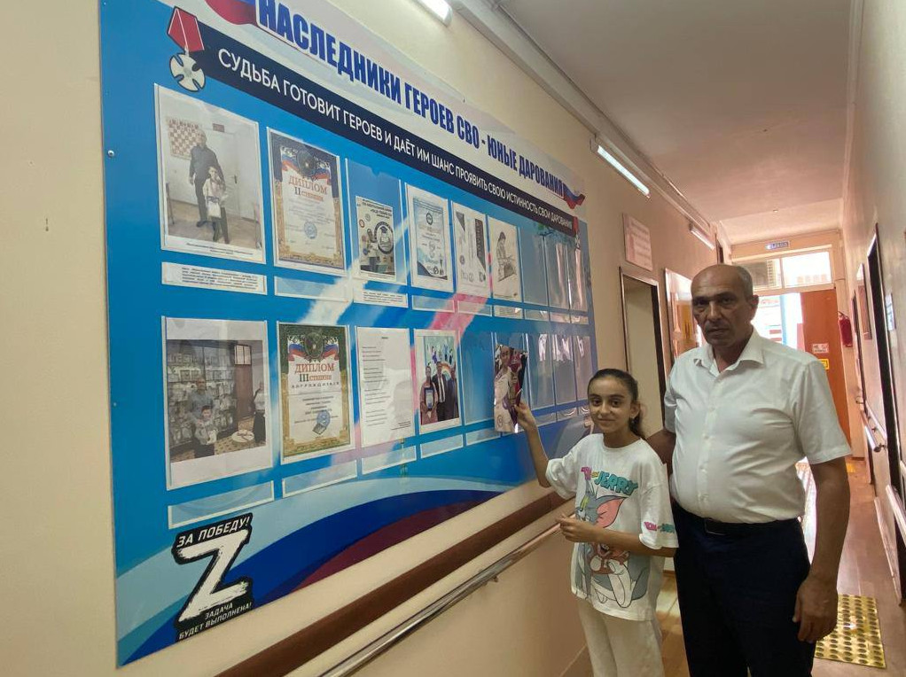 Девочка с гордостью разместила копию своей награды на стенд « Наследники Героев СВО – юные дарования», подготовленный специалистами центра социального обслуживания.