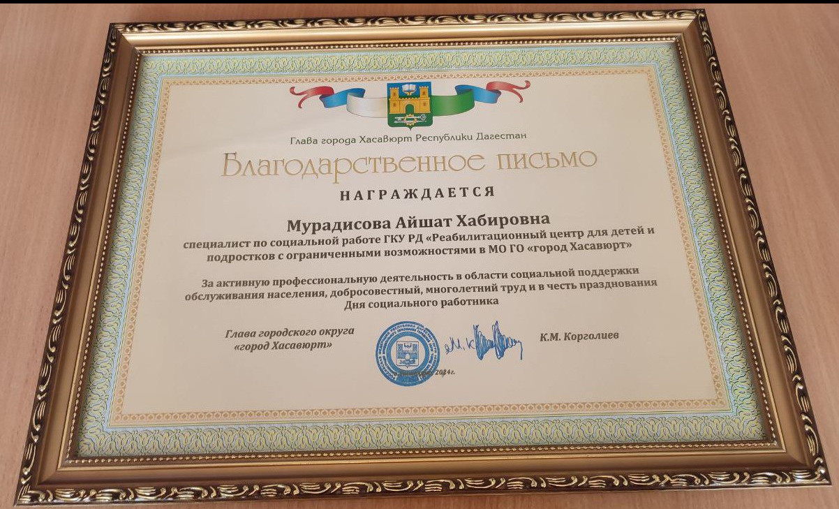 Специалист по социальной работе Мурадисова Айшат, награждена за активную профессиональную деятельность в области социальной поддержки обслуживания населения, добросовестный, многолетний труд. Церемония награждения была приурочена к профессиональному празднику работников – Дню социального работника.