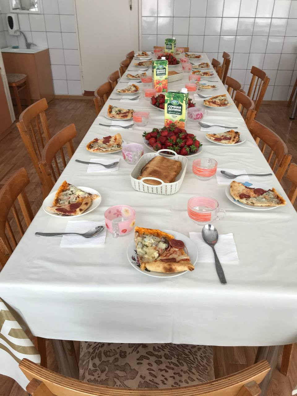 ?Они преподнесли детям пиццы, чуду, натуральные соки, ну и всеми любимую клубничку.
