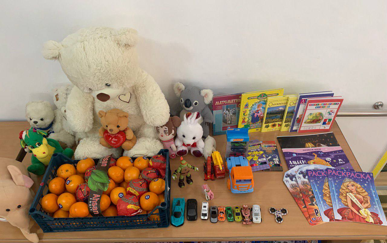 Гости преподнесли в подарок детям, игрушки, книги, раскраски , канцтовары и сладости с мандаринами.