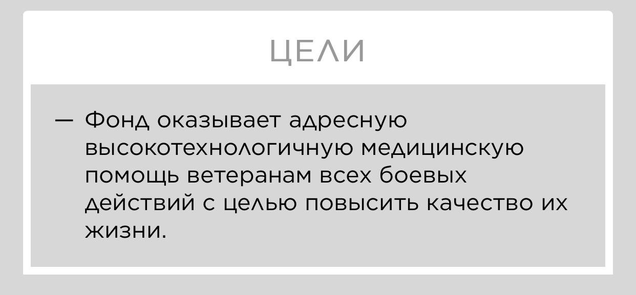 Благотворительный фонд «ПАМЯТЬ ПОКОЛЕНИЙ» оказывает медицинскую помощь ветеранам боевых действий. Миссия Фонда - обьединить в деле помощи ветеранам всех граждан России без исключения, независимо от их возраста, пола, социального положения, дохода, политических, религиозных и других взглядов. В настоящее время Фондом оказана помощь более 17 300 ветеранам по всей территории России.