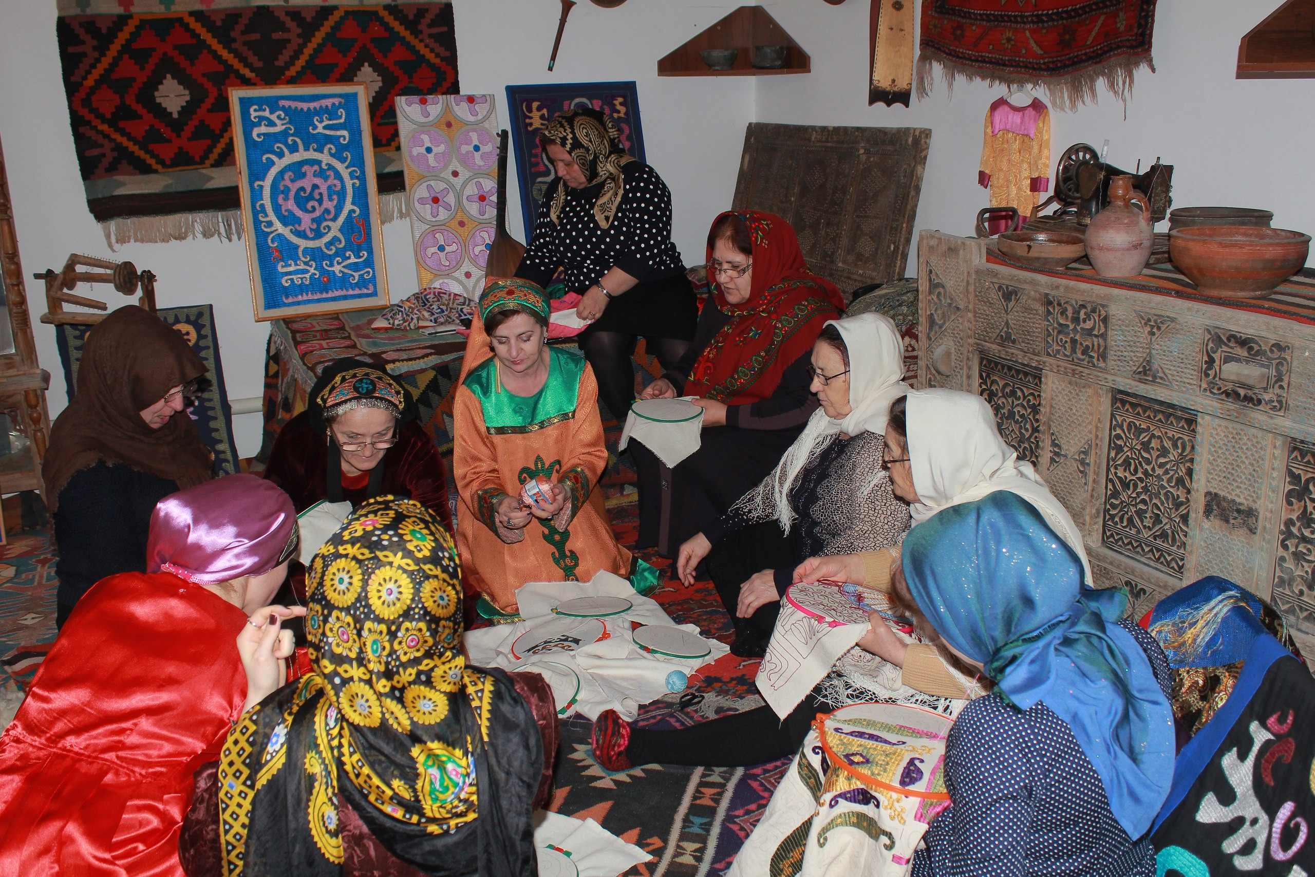 Магомедова Разият – специалист Этноцентра «Кайтаги», ознакомила всех собравшихся с выставкой национальных костюмов, с особенностями творческого процесса, сопровождая его иллюстрациями. Также рассказала много интересного о традициях и обрядах, связанных с Кайтагской вышивкой. После экскурсии все присутствующие были приглашены на творческий мастер-класс по изготовлению панно "Кайтагской вышивки".