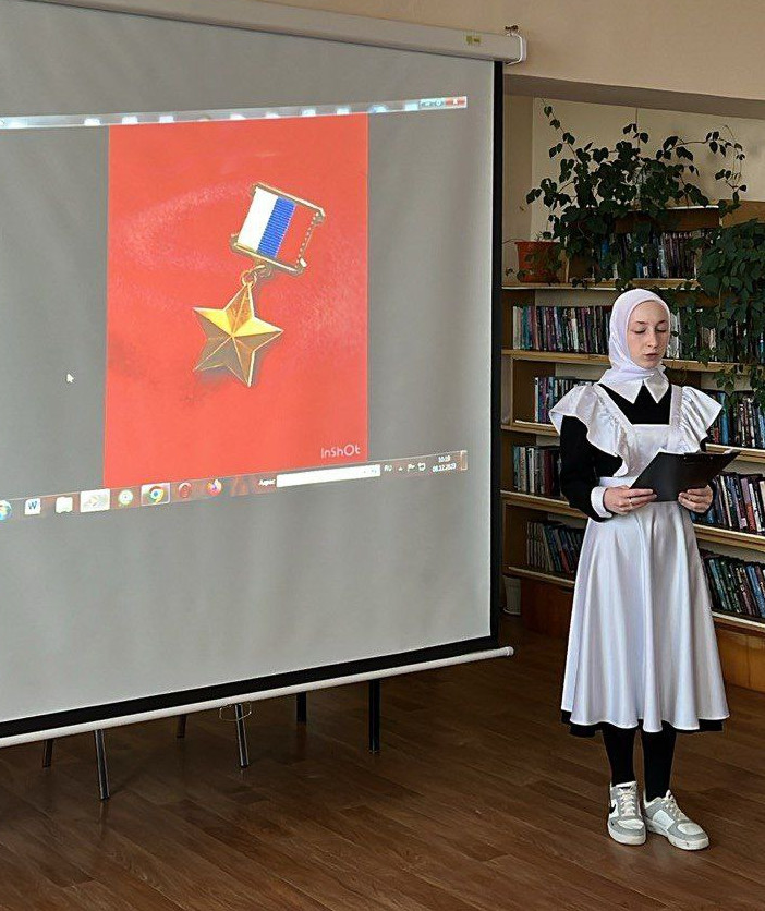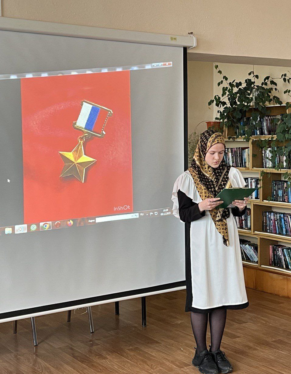 Ведущий инспектор ЦЗН Мадина Магдиханова в своем выступлении отметила, что героизм проявляется не только в бою. Настоящие герои нашей страны- передовики труда, науки и спорта. Их достижения служат надежной опорой России, способствуют ее процветанию и укреплению. Привела примеры, когда люди мирной профессии совершают героический поступок, сделав нравственный выбор в пользу других, в пользу своей Родины. Это те, кто спасает людей в экстренных ситуациях: мы помним героизм наших врачей в период пандемии, известен нам также пример летчика Дамира Юсупова , который спас 233 жизней , посадив пассажирский самолет на кукурузном поле и др.