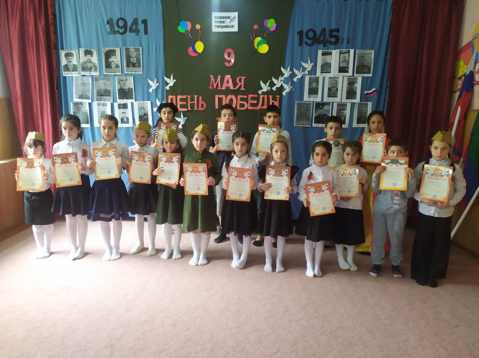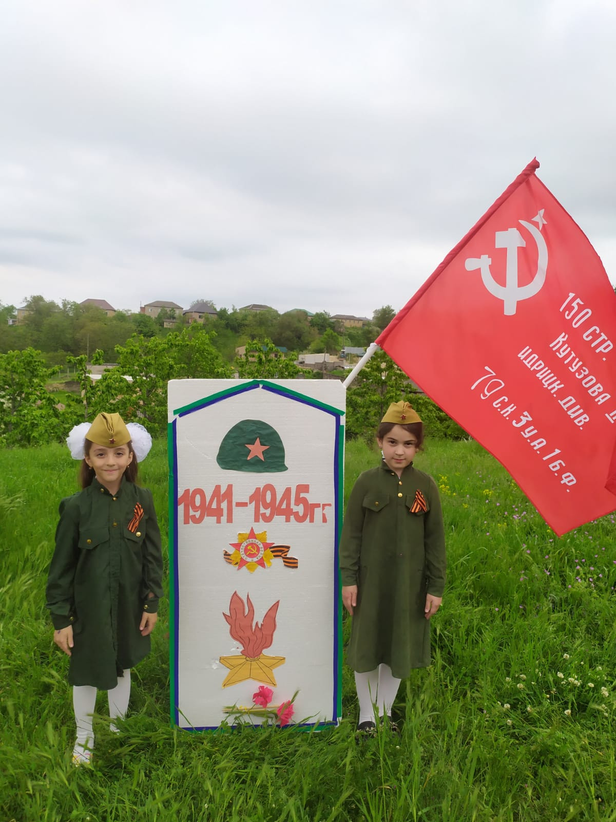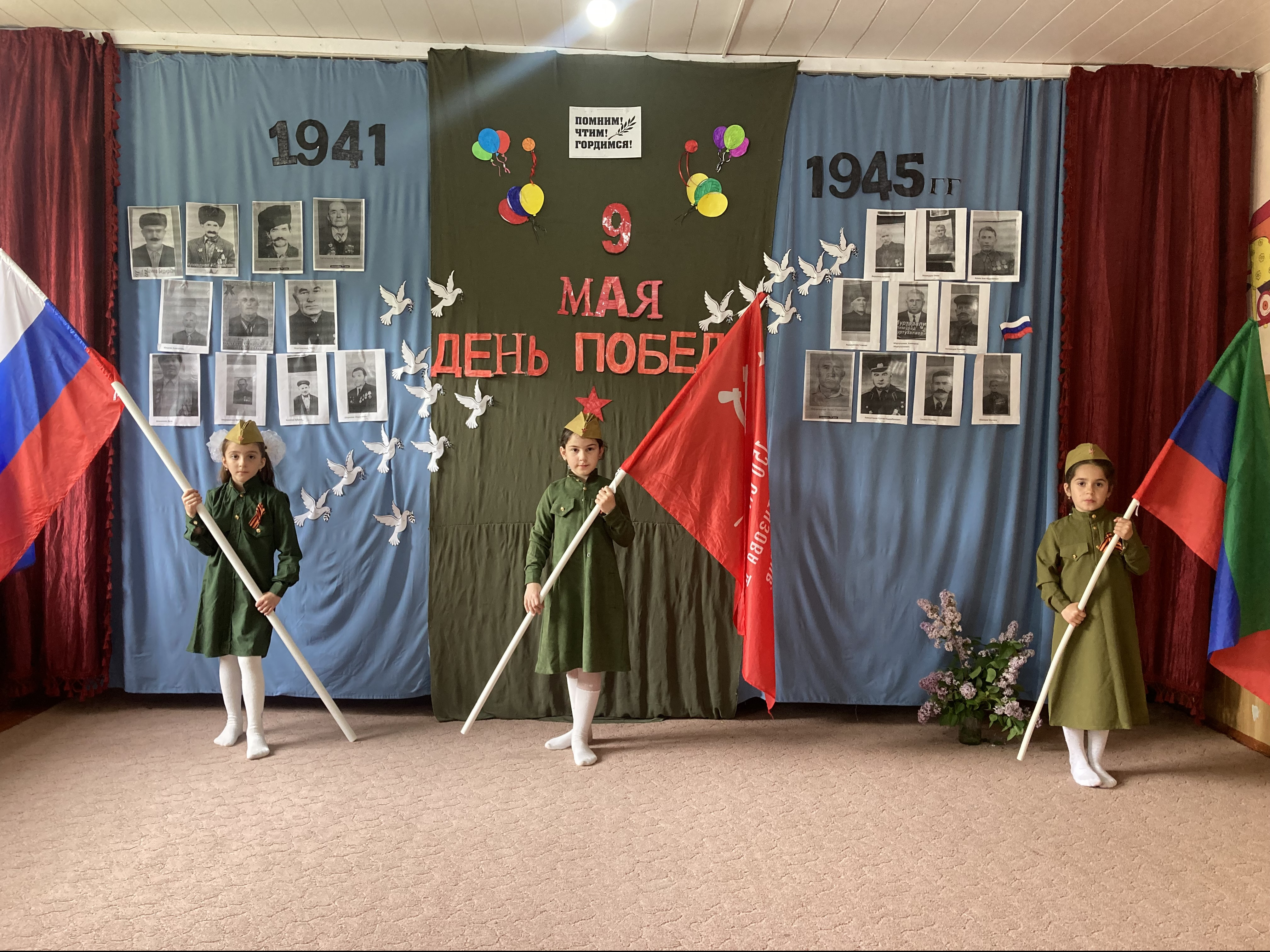 Одна из программы данного мероприятия включала в себя демонстрацию сценки «Знамя победы». На празднике дети, с чувством особой благодарности читали стихи, исполнили песню «Катюша», показали сценку «Мама и дочь», национальный танец «На лугу», танец «Мир в детских руках». Организован и проведен конкурс с выставками работ на данную тематику. Дети приготовили красочные открытки, рисунки и оригинальные поздравительные письма адресованные ветеранам войны и труженикам тыла.