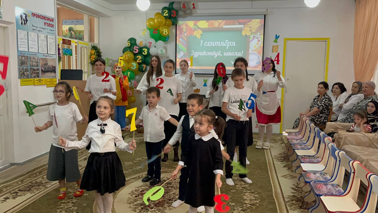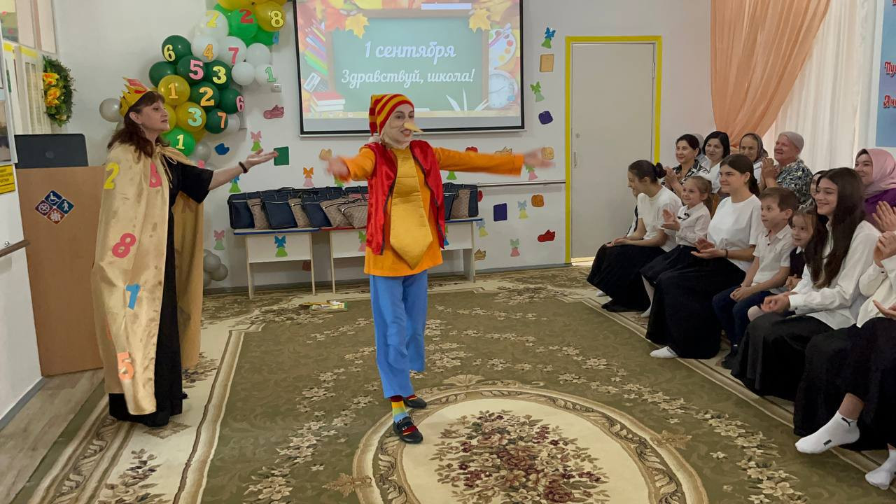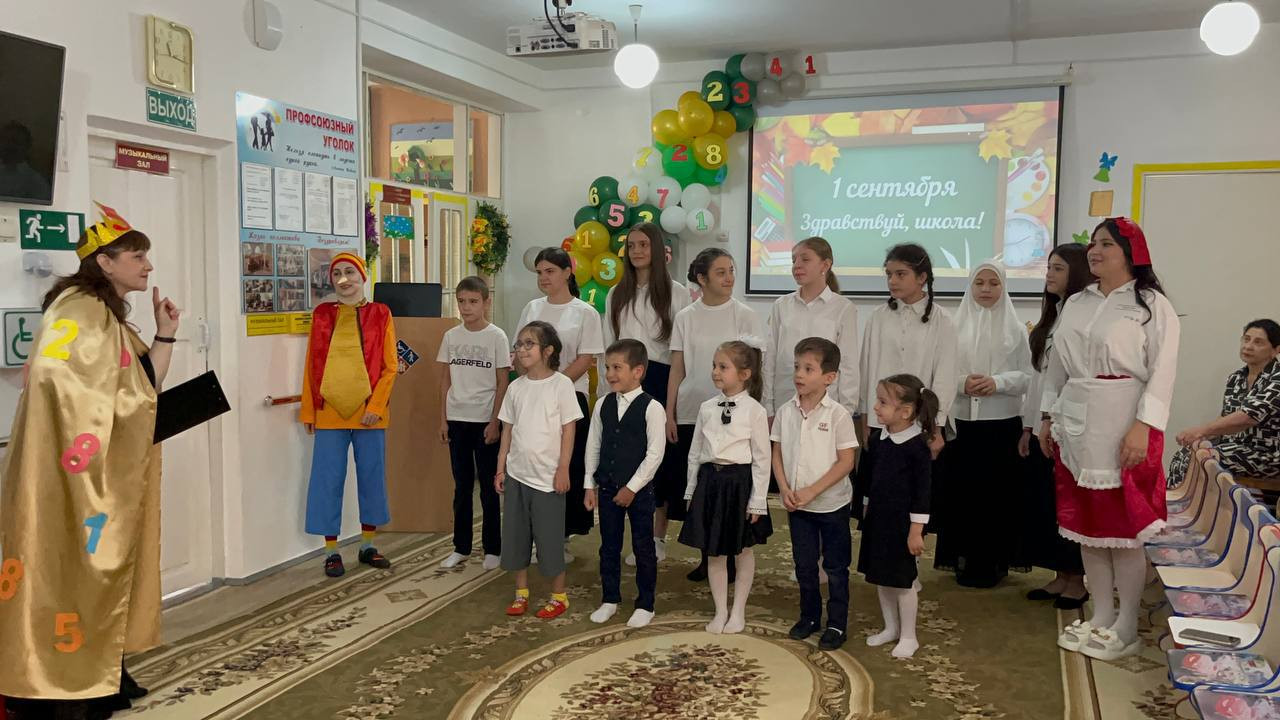 Зал был оформлен торжественно и нарядно умелыми руками инструктора по труду Гусейновой Земфиры. Мероприятие открыла директор Центра Гасанова Загра Магомедовна с пожеланиями детям крепкого здоровья и успехов на пути к получению новых знаний. В гости к детям пришли сказочные персонажи: Царица Знаний, Буратино, Красная Шапочка, Шапокляк, роли которых исполняли специалисты центра Ибрагимова Альбина, Алиева Хаписат, Салаватова Айгуль, Мурадисова Айшат. Они провели с детьми конкурсы, игры, загадывали загадки, танцевали флешмоб. Дети прочитали стихи и исполнили песни «Чему учат в школе " , «Учиться надо весело».