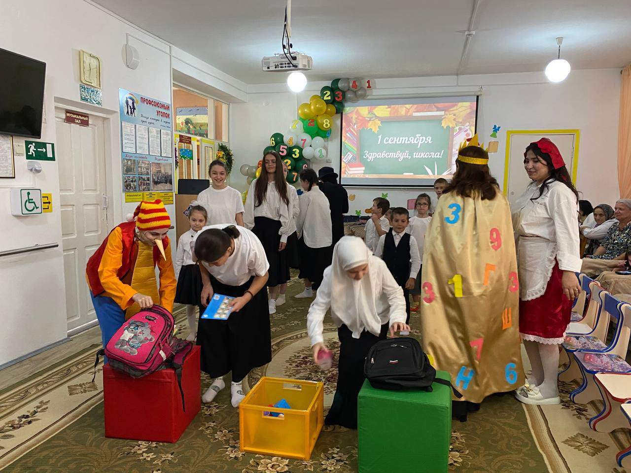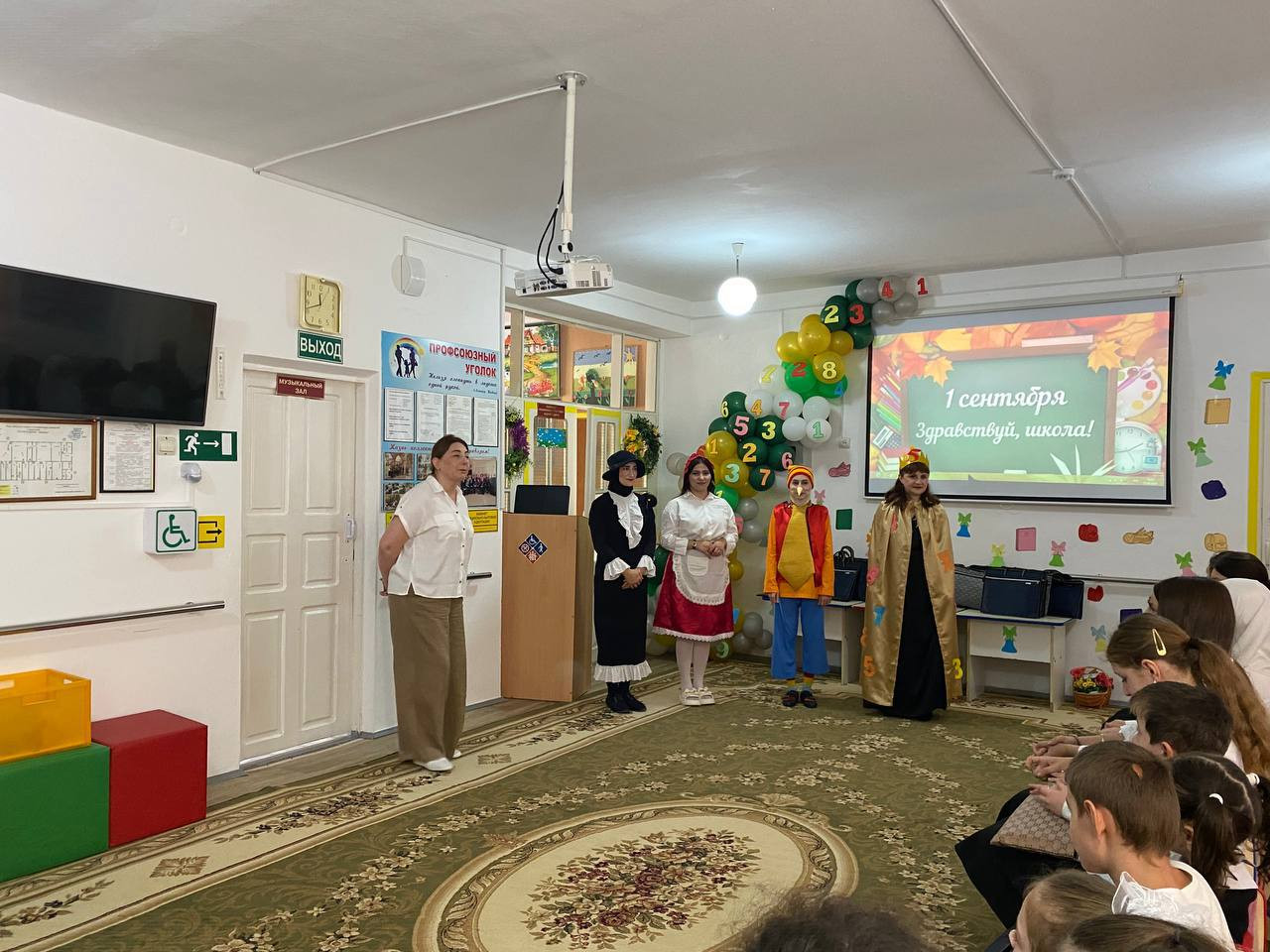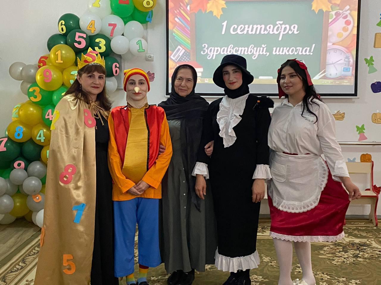 Зал был оформлен торжественно и нарядно умелыми руками инструктора по труду Гусейновой Земфиры. Мероприятие открыла директор Центра Гасанова Загра Магомедовна с пожеланиями детям крепкого здоровья и успехов на пути к получению новых знаний. В гости к детям пришли сказочные персонажи: Царица Знаний, Буратино, Красная Шапочка, Шапокляк, роли которых исполняли специалисты центра Ибрагимова Альбина, Алиева Хаписат, Салаватова Айгуль, Мурадисова Айшат. Они провели с детьми конкурсы, игры, загадывали загадки, танцевали флешмоб. Дети прочитали стихи и исполнили песни «Чему учат в школе " , «Учиться надо весело».