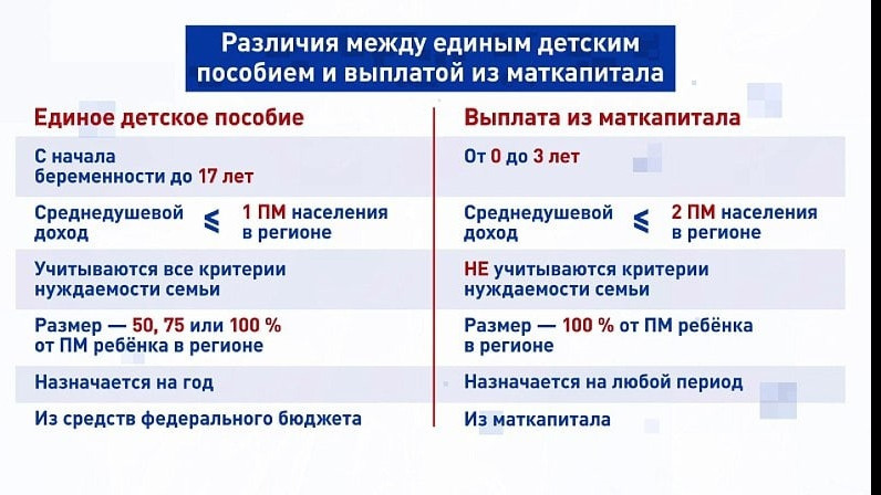 Все эти критерии очень схожи с теми, которые существуют для единого детского пособия, появившегося в текущем году, но между ними есть принципиальные различия. Главное: единое пособие платят на детей от рождения до 16 лет включительно, и даже во время его нахождения в утробе матери (доступно беременным, вставшим на учёт до 12 недель). При этом на такое пособие претендуют лишь те семьи, чей средний доход не превышает 1 прожиточный минимум (а не 2, как в случае с выплатой из маткапитала). Кроме того, тут учитываются не только доходы, но и другие критерии нуждаемости семьи, включая наличие квартир и машин. Также отличается размер двух выплат, если из материнского сертификата это всегда 100% прожиточного минимума, то единое пособие могут выплачивать и в размере 75% или даже 50% от него — в зависимости от нуждаемости.