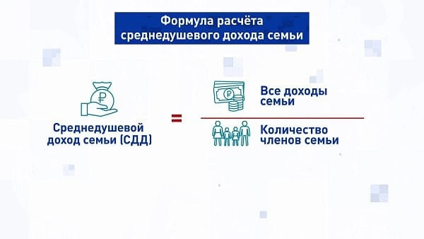 Среднедушевой доход семьи следует рассчитывать, исходя из всех денег, которые получает семья — эту сумму делят на количество членов семьи. Полученную цифру сравнивают с величиной прожиточного минимума по региону проживания (в среднем по РФ это 13,9 тысяч рублей) умноженную на два. Пособие можно получить только если среднедушевой доход семьи ниже этой цифры.