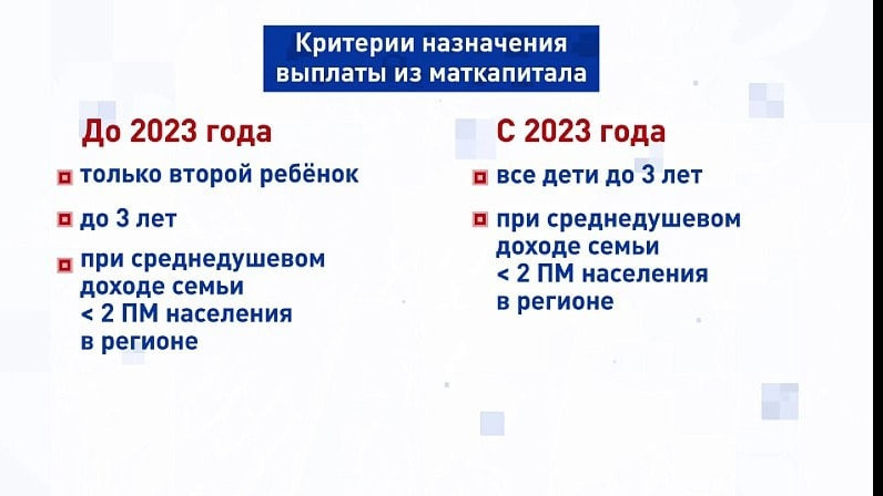 Кроме того, как сообщил 21 февраля Президент РФ Владимир Путин, в ДНР, ЛНР, Херсонской и Запорожской областях маткапитал смогут получить все семьи, где дети родились после 2007 года.