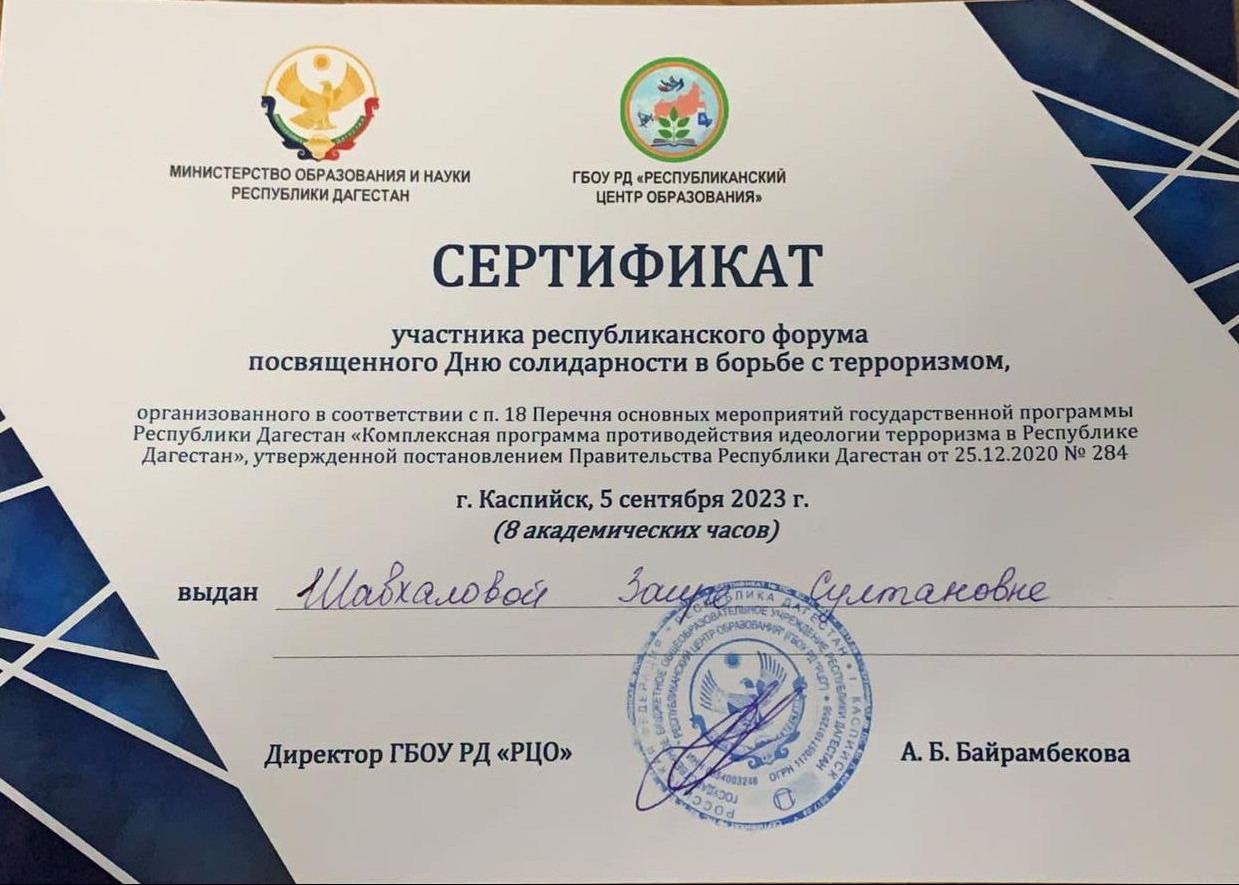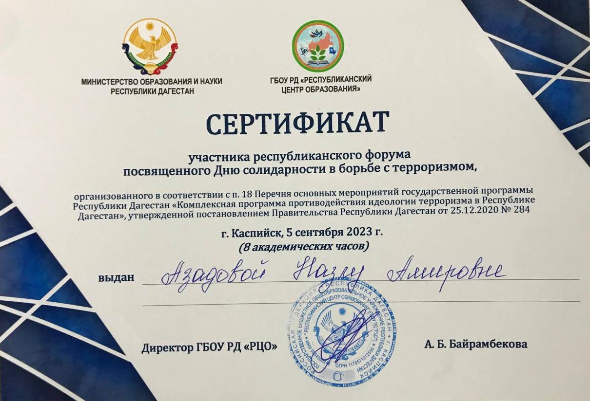 Психологи Комплексного центра социального обслуживания населения по Хасавюртовскому району Шавхалова Заира и Азадова Назлу. Приняли участие в Республиканском форуме, посвящённому дню солидарности в борьбе с терроризмом. Цели форума: 1. Профилактика среди молодёжи идеологии терроризма и привитие им традиционных для Российской Федерации духовно- нравственных ценностей. 2. Создание площадок эффективного взаимодействия министерств, ведомств, образовательных организаций, общественных движений и объединений для формирования системы мер, направленных на профилактику терроризма в Республике Дагестан. В секции «Профилактика идеологии терроризма в образовательной организации» в роли спикера выступила психолог Азадова Назлу, с мастер- классом «Явление экстремизма в молодежной среде».