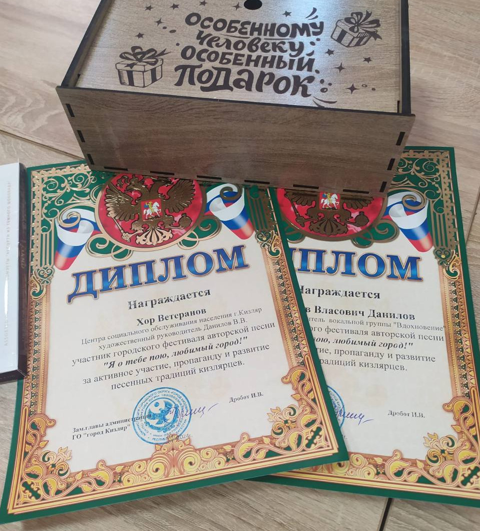 В предверии дня города, активисты отделения дневного пребывания хор "Ветеран" выступили в музыкальной школе на конкурсе "Авторской песни". Исполнили две песни - «Судьба и пристань - мой Кизляр» и премьера песни «Россия - это мы!» под музыкальным сопровождением культорганизатора Данилова В.В. В завершении мероприятия, ветеранов наградили грамотой и подарками.