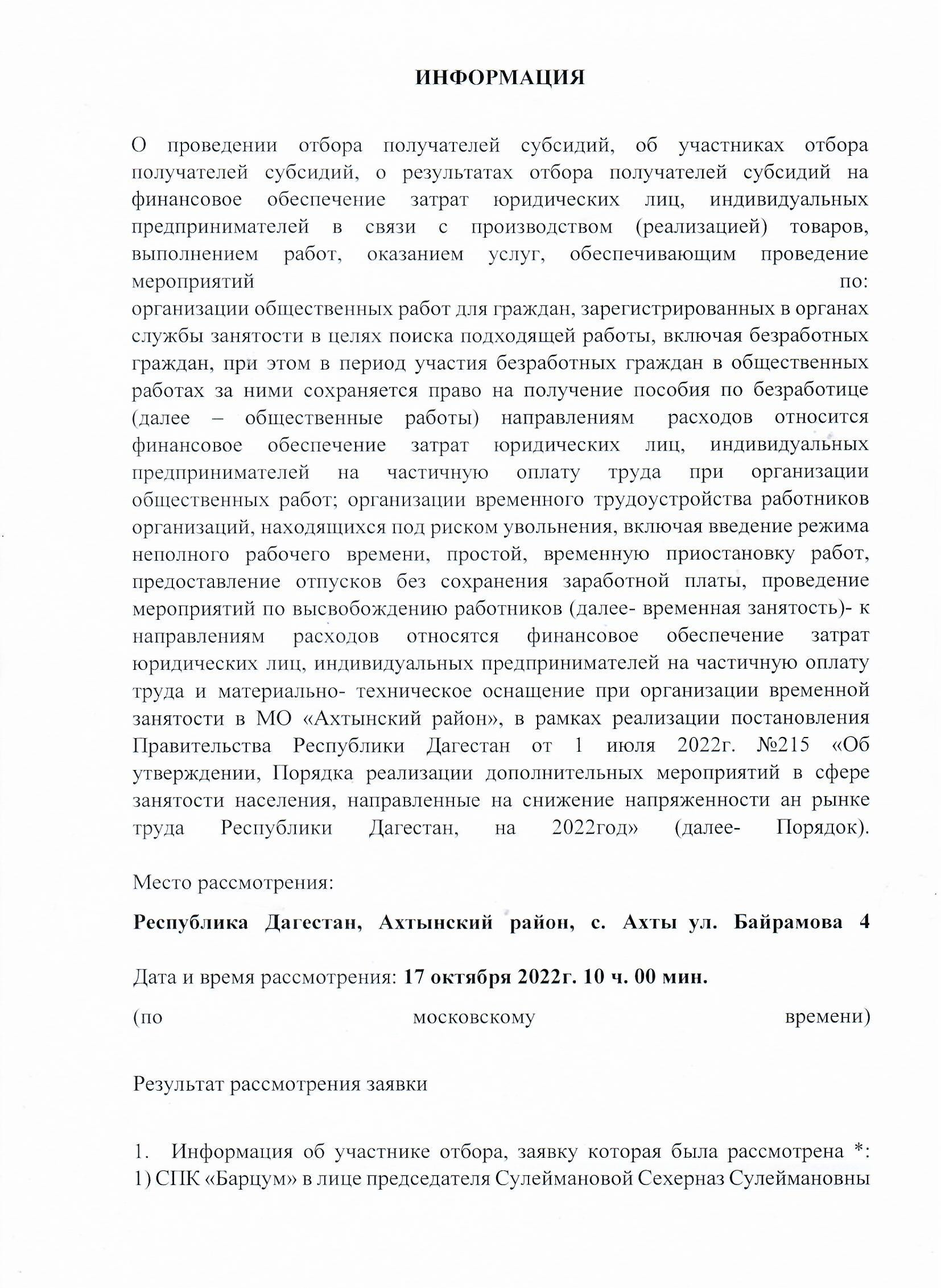 1 СПК «Барцум» в лице председателя Сулеймановой Сехерназ Сулеймановны 0504008062 1030500605937 Организация общественных работ для граждан, зарегистрированных, в органах службы занятости в целях поиска подходящей работы, включая безработных граждан
