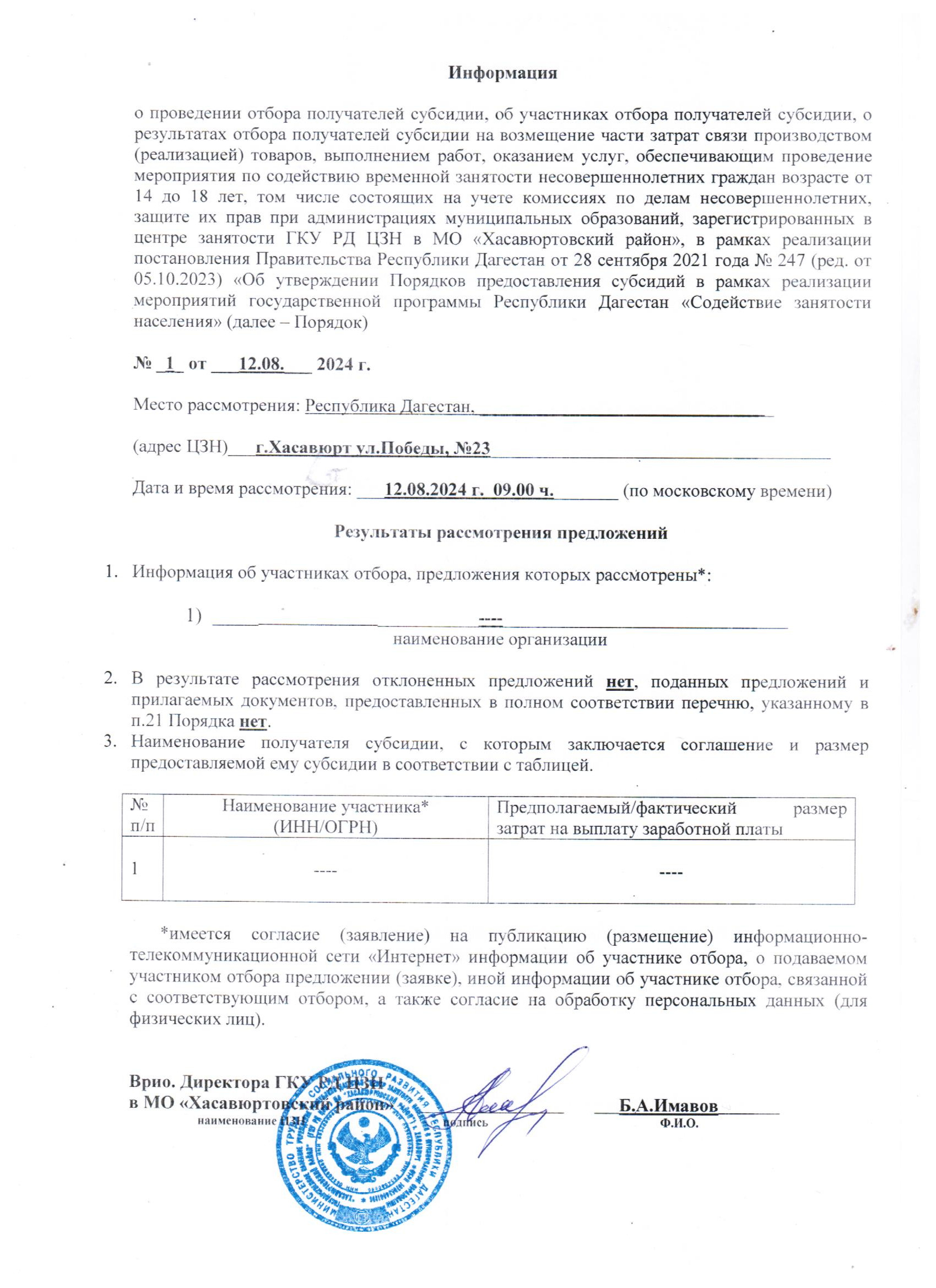 Информация о  результатах отбора получателей субсидии на возмещение части затрат по содействию временной занятости несовершеннолетних граждан возрасте от 14 до 18 лет