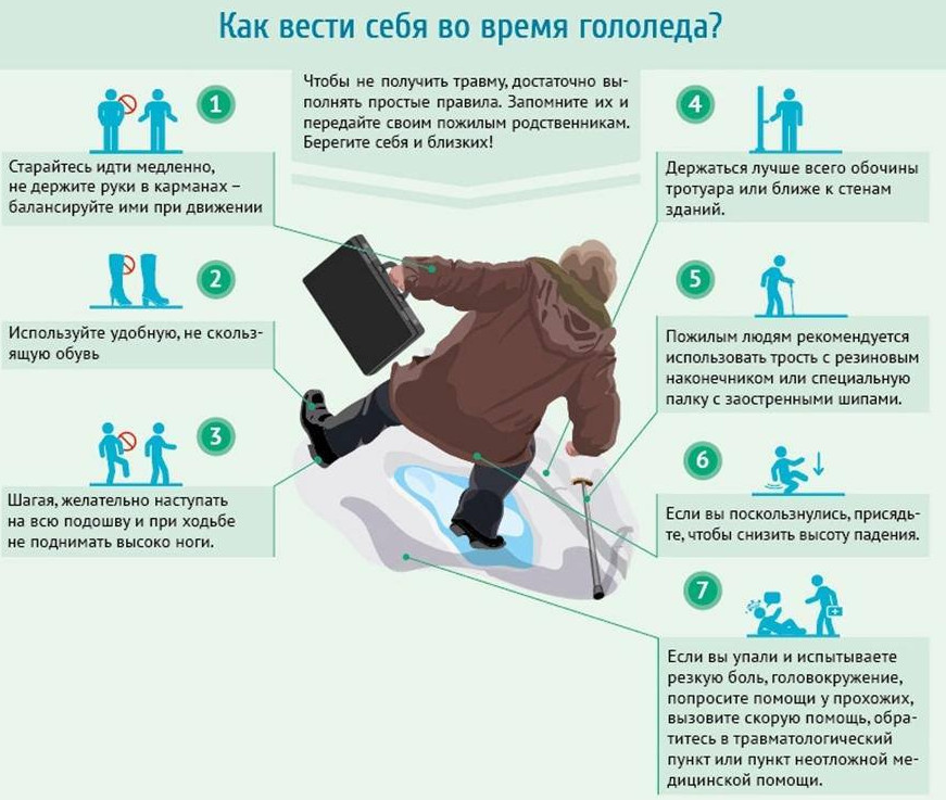 В зимнее время в разы увеличивается количество травм, вызванных падениями: вывихи, растяжения, ушибы, переломы.Гололед чреват тяжелыми травмами для пожилых, так как кости с возрастом становятся более хрупкими. Поэтому при выходе на улицу обязательно нужно соблюдать определённые правила,чтобы уберечься от падений.