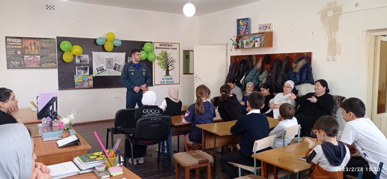 По инициативе ответственного по охране труда Атагишиевой Э. инспектор Магомедов М. М. ОНД и ПР №4 по городу Буйнакск, Буйнакскому и Унцукульскому районам провёл с получателями социальных услуг и сотрудниками беседу на тему "Как вести себя в чрезвычайных ситуациях". Так же сотрудник МЧС продемонстрировал работу огнетушителя.