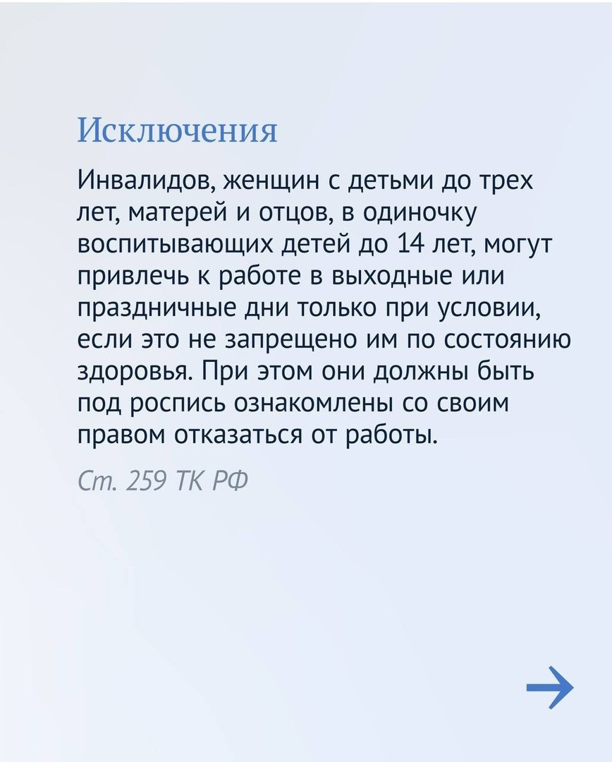 - у некоторых категорий работников согласие спрашивать необязательно, а других, например женщин с детьми до трех лет, можно привлечь к работе в выходные, только если это не запрещено по состоянию здоровья;