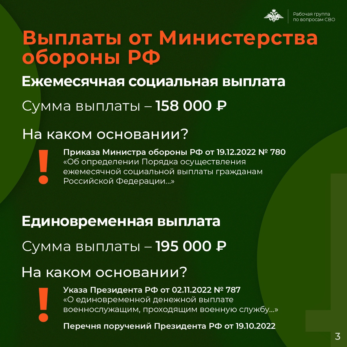 Подробнее о выплатах читайте в карточках, подготовленных при поддержке Минобороны России и Рабочей группы по вопросам СВО