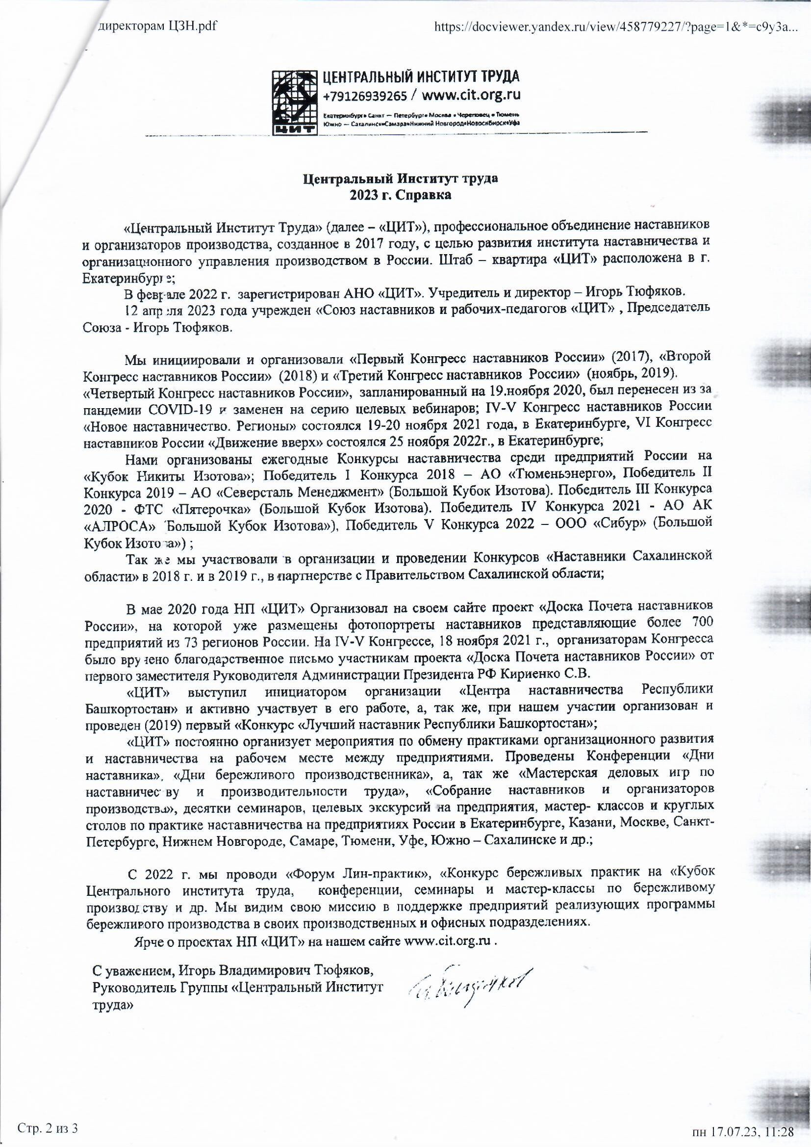 ?В соответствии с поручением Главы Республики Дагестан от 14 июня 2023г. по обращению Союза наставников и рабочих педагогов «Центральный институт труда» предлагают руководителям предприятий республики о возможности принять участие в конкурсах Союза наставников «ЦИТ».
