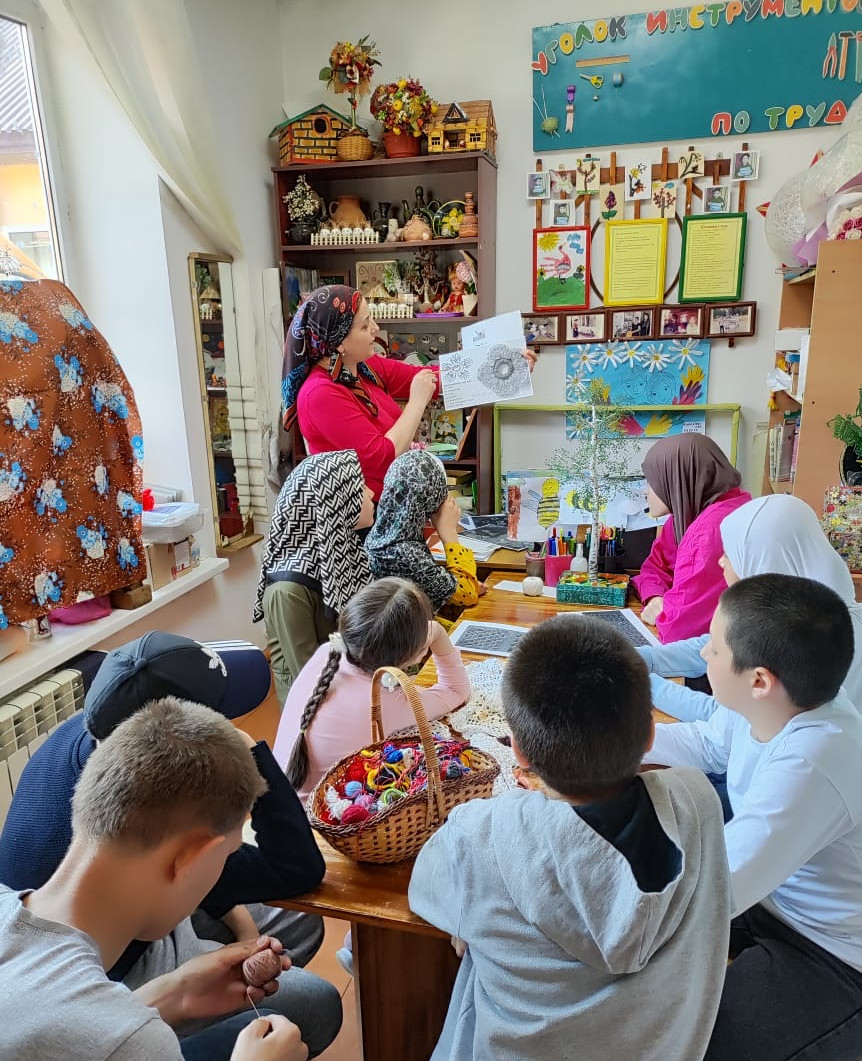На кружке несовершеннолетние обучаются чтению схем вязания , вязанию столбика без накида, соединительному столбику.