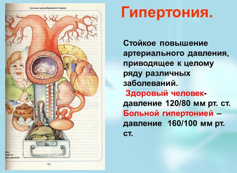 Гипертония. Стойкое повышение артериального давления, приводящее к целому ряду различных заболеваний. Здоровый человек- давление 120/80 мм рт. ст.Больной гипертонией – давление 160/100 мм рт. ст.