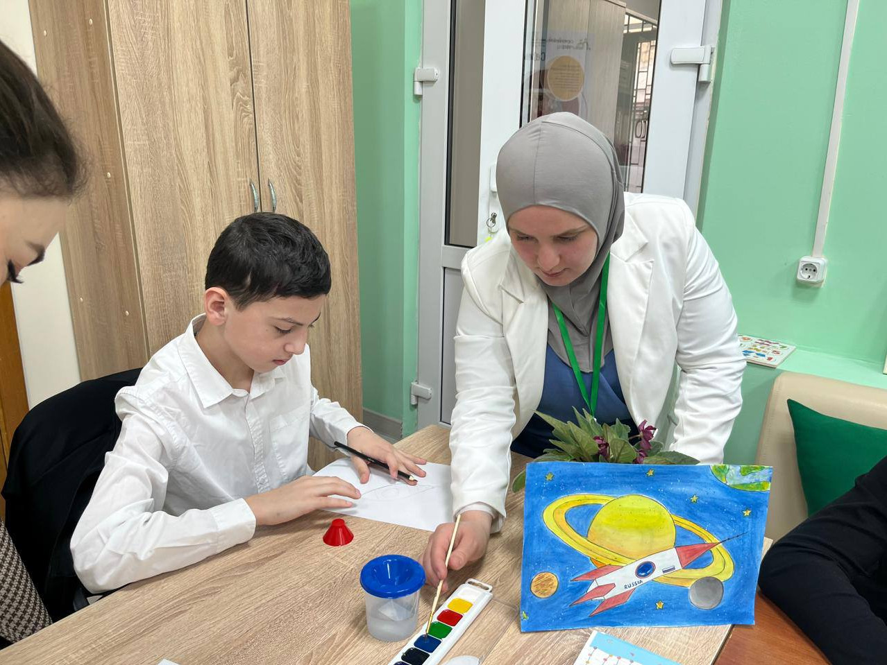 Приглашенный учитель изобразительного искусства МБОУ СОШ №8 Алиева РухсараТагировна провела в Семейном МФЦ мастер-класс «На просторах Вселенной» для юных получателей соцуслуг. Ребята использовали нетрадиционную технику рисования «граттаж». Вначале на лист белого картона дети наносили акварель разных цветов, потом натирали лист воском, покрывали толстым слоем черной или фиолетовой гуаши. И уже на высохшем листе с помощью палочки рисовали звезды и планеты. Организованный мастер-класс подарил юным участникам большое количество незабываемых и радостных эмоций.
