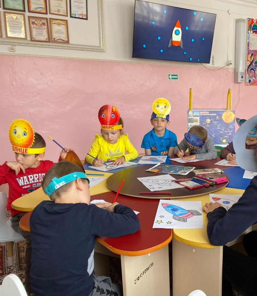 Для ребят был организован просмотр поучительного фильма о звездах и планетах. Дети рассмотрели книги, иллюстрации и портреты космонавтов, слушали песни, читали стихотворения о космосе и покорителях космоса, играли в различные игры и рисовали, строили из деревянного конструктора ракету.