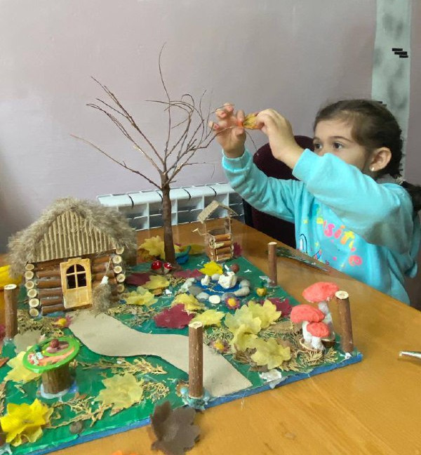 Во время занятия для развития мелкой моторики использовались природные материалы, при помощи которых дети сделали деревенское подворье, украшали дворик камешками, палочками, скорлупой и сухоцветами. Запоминающимся моментом занятия стало появление хозяйки домика.