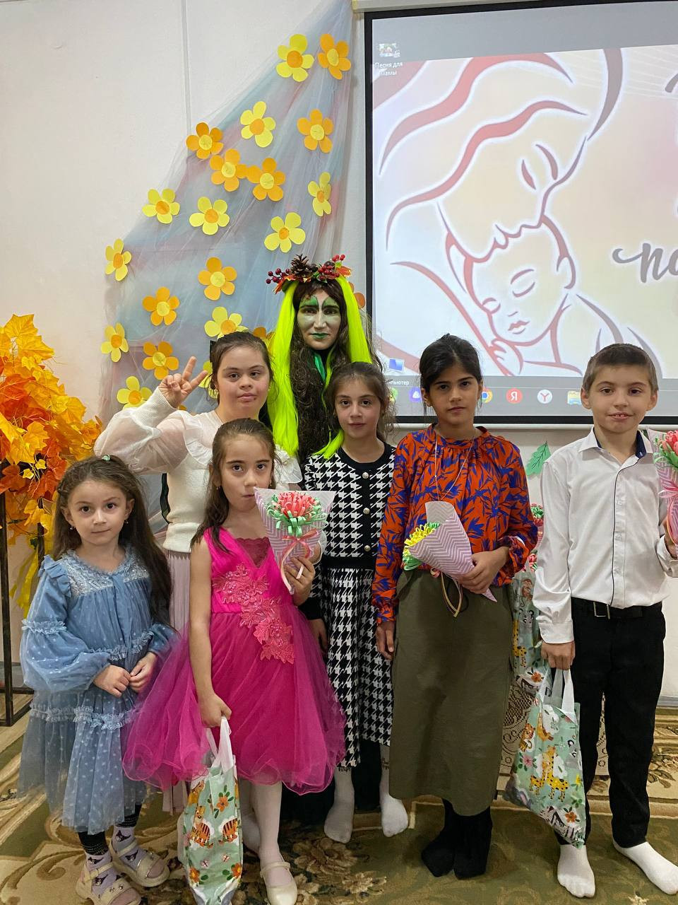 Также наших подопечных порадовала своими играми,танцами и веселым настроением сказочный персонаж "Кикимора" в исполнении специалиста по соц.работе Хабировой Айшат. Концу мероприятия дети вручили мамам букеты выполненные на занятиях по трудотерапии под руководством инструктора по труду Гусейновой Земфиры.