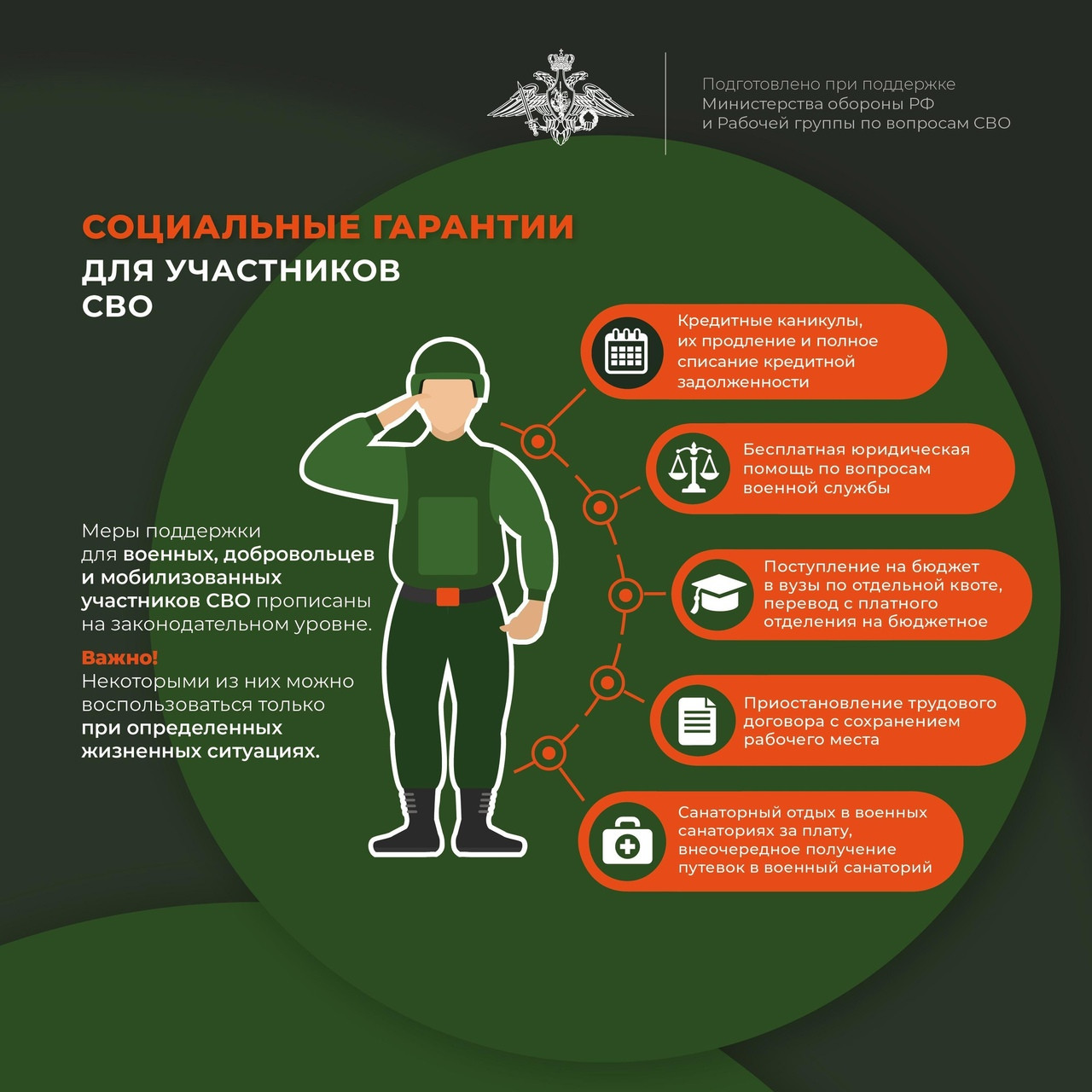 Подробнее о социальных гарантиях для участников СВО читайте в карточках, подготовленных при поддержке Минобороны России и Рабочей группы по вопросам СВО