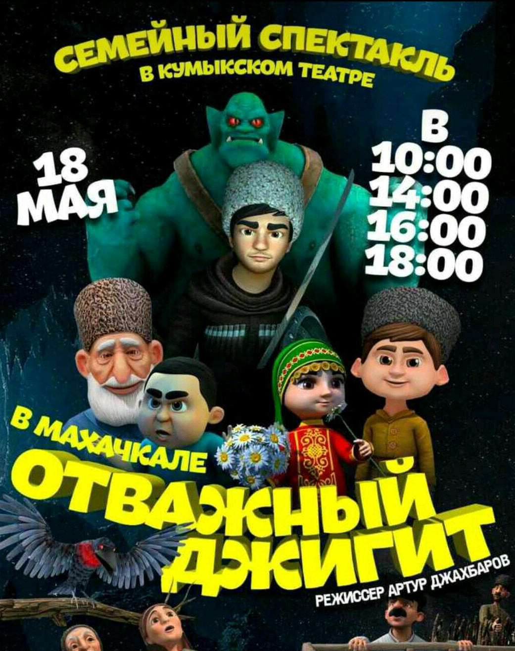 Премьера спектакля по мотивам дагестанского мультфильма «Отважный джигит» состоялась 16 мая в Кумыкском музыкально-драматическом театре в Махачкале. Режиссер-постановщик – Артур Джахбаров, который почти 20 лет работает в Русском драматическом театре.