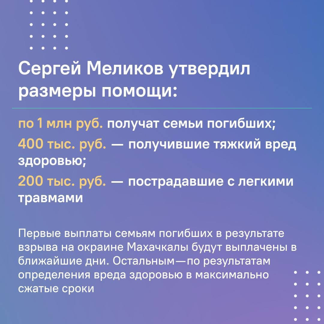По поручению Сергея Меликова в ближайшее время средства будут перечислены всем семьям погибших и пострадавших.