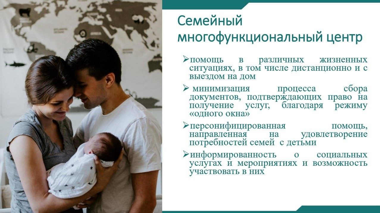 В региональных комплексах мер запланировано обучение руководителей и специалистов по направлениям деятельности Семейных МФЦ. Будут созданы новые специализированные социальные сервисы для семей. Это службы экстренного реагирования, выездные мобильные бригады, группы кратковременного пребывания, пункты социального проката, семейные диспетчерские, психологические онлайн-приемные, семейные приемные, социальные гостиницы и другие сервисы.