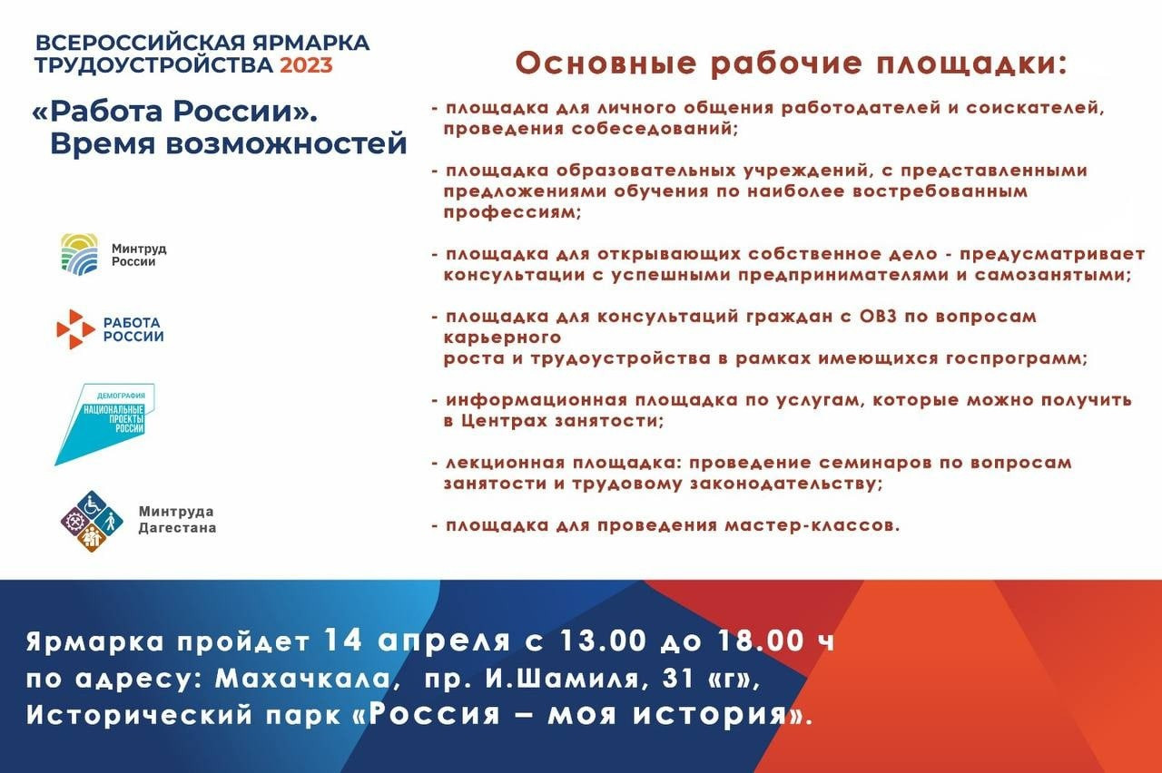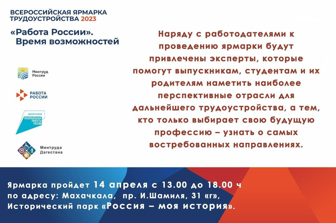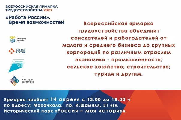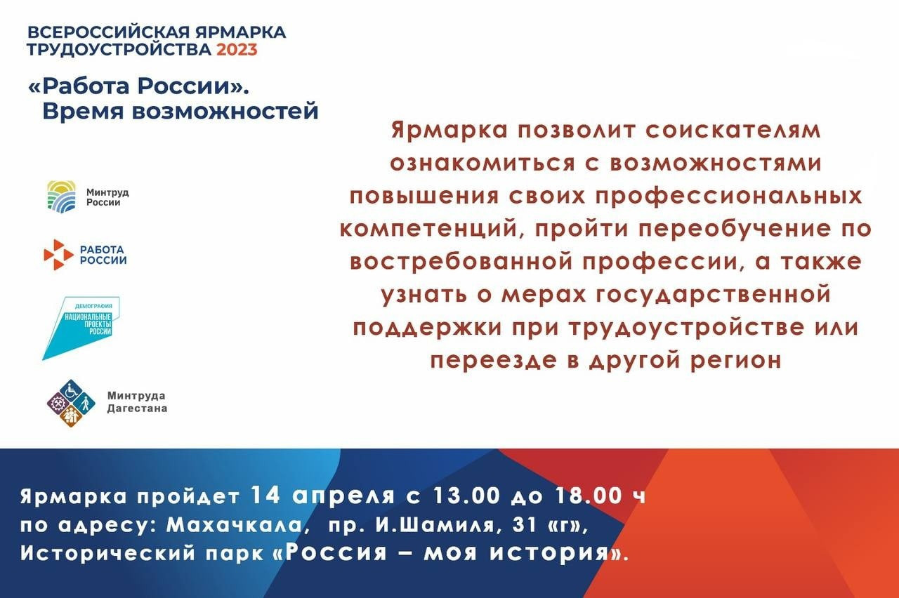 Первый этап Всероссийской ярмарки трудоустройства «Работа России. Время возможностей» состоится 14 апреля в Дагестане. Ярмарка пройдет с 13:00 до 18:00 в историческом парке «Россия – моя история» в Махачкале.