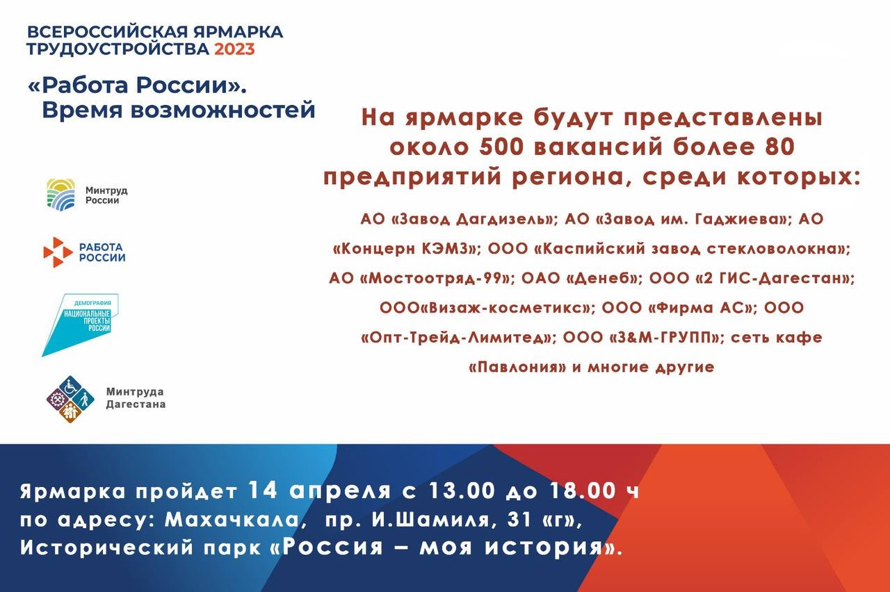 Первый этап Всероссийской ярмарки трудоустройства «Работа России. Время возможностей» состоится 14 апреля в Дагестане. Ярмарка пройдет с 13:00 до 18:00 в историческом парке «Россия – моя история» в Махачкале.