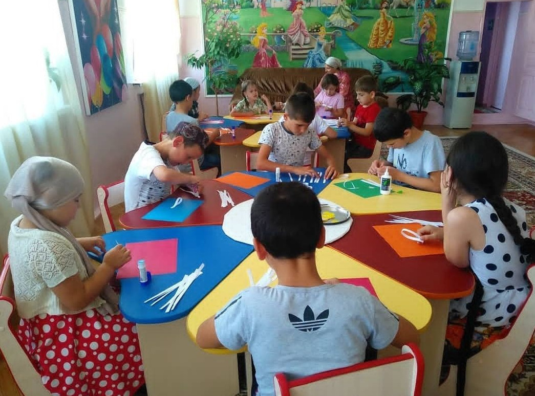 Специалисты подготовили несколько локаций: с подвижными играми, песнями, танцами. Любители творчества и рисования проявили свои таланты в поделках и рисунках. Вместе с музыкальным руководителем Загрой Эмечовой ребята исполнили хор рук "Ромашка".