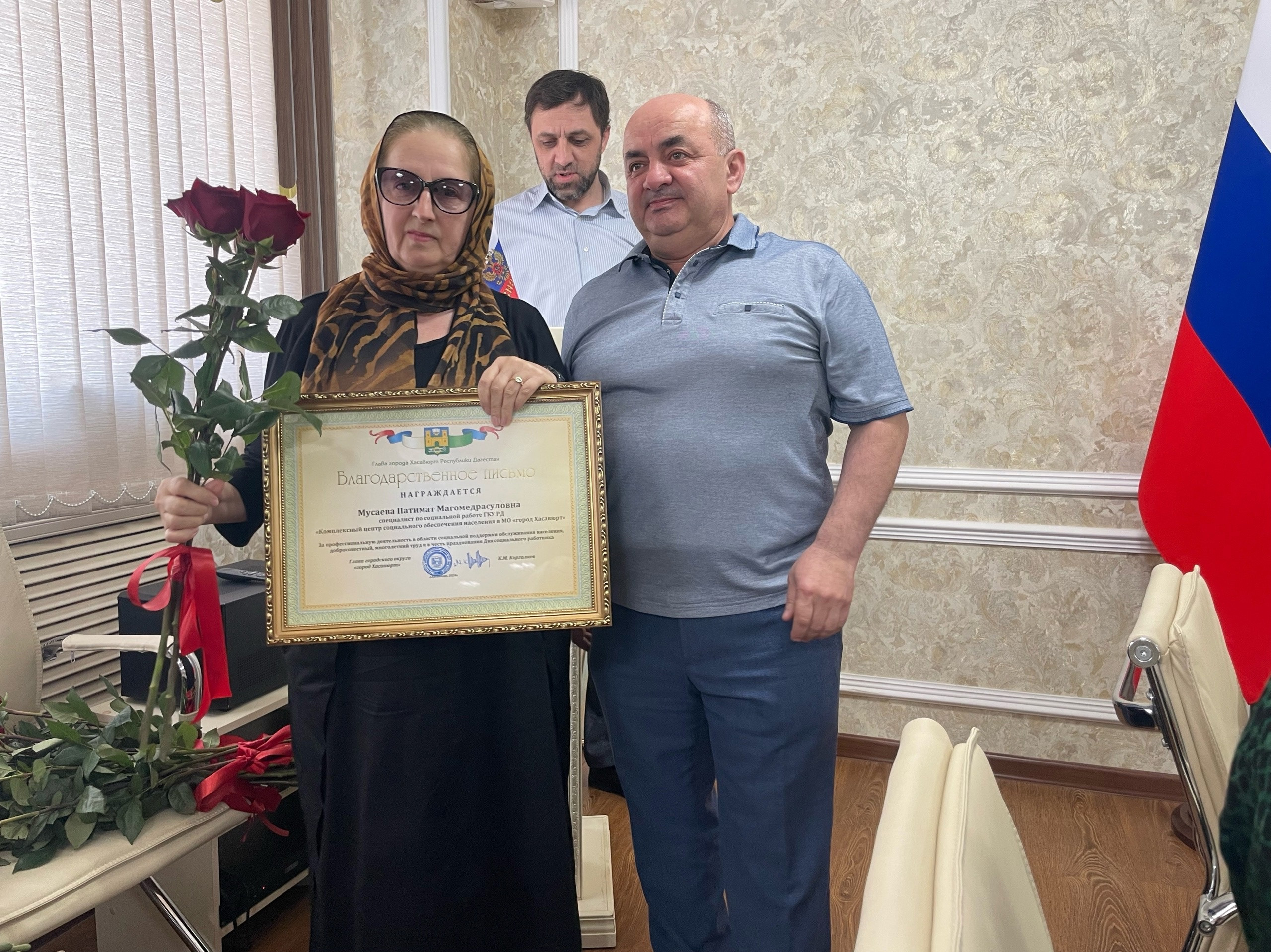 В преддверии Дня социального работника от главы администрации города Хасавюрт Корголи Корголиева были вручены благодарственные письма работникам нашего Центра. От имени главы города работников социальной сферы поблагодарил за нелегкий труд и пожелал дальнейших успехов первый замглавы Арсен Абдулвагитович.