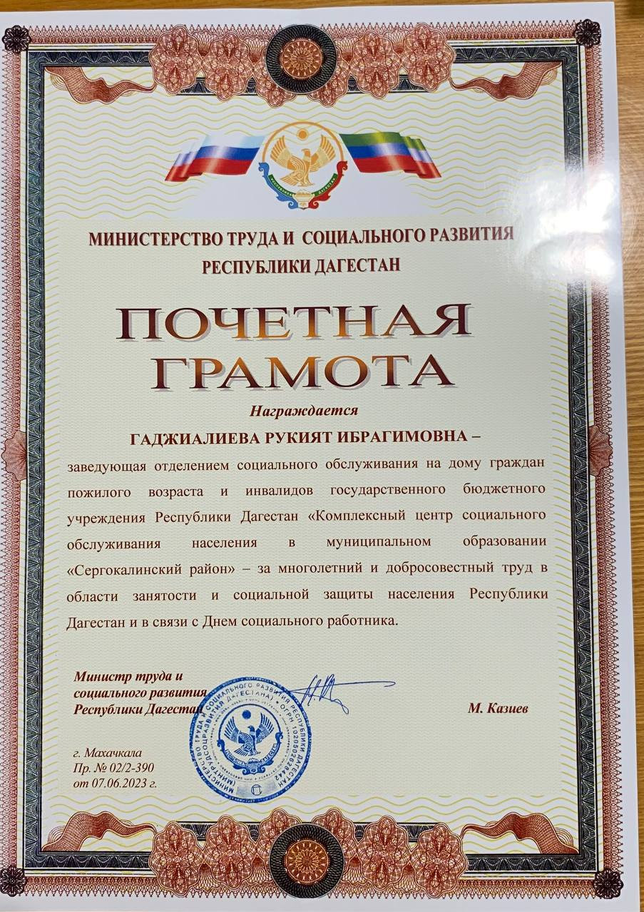 Сегодня Почетными грамотами Министерства труда и социального развития, за многолетний добросовестный труд в области занятости и социальной защиты населения, из рук Директора Комплексного Центра социального обслуживания населения Муртузалиева Магомеда Исаевича награждены: