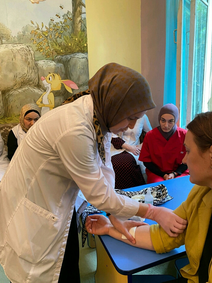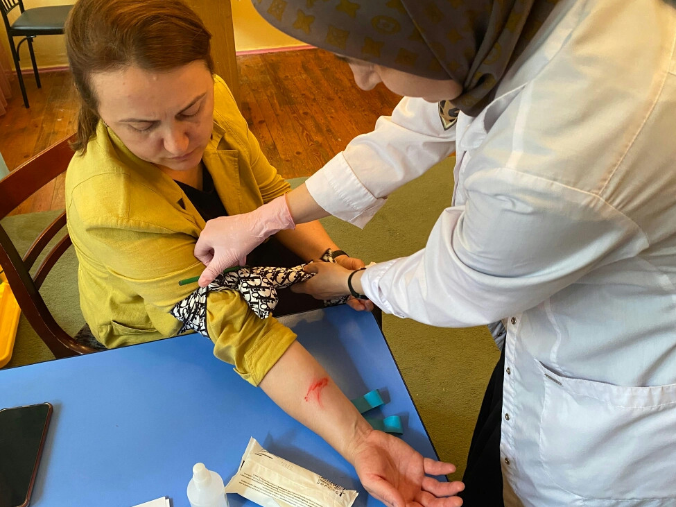 28 июня медсестра Саният Алидибирова прочитала лекцию и продемонстрировала приёмы оказания первой помощи при кровотечениях. В качестве «пострадавшего» выступила заведующая отделением. На её примере были показаны возможные травмы и действия, которые необходимо предпринять с использованием подручных средств до приезда скорой помощи.
