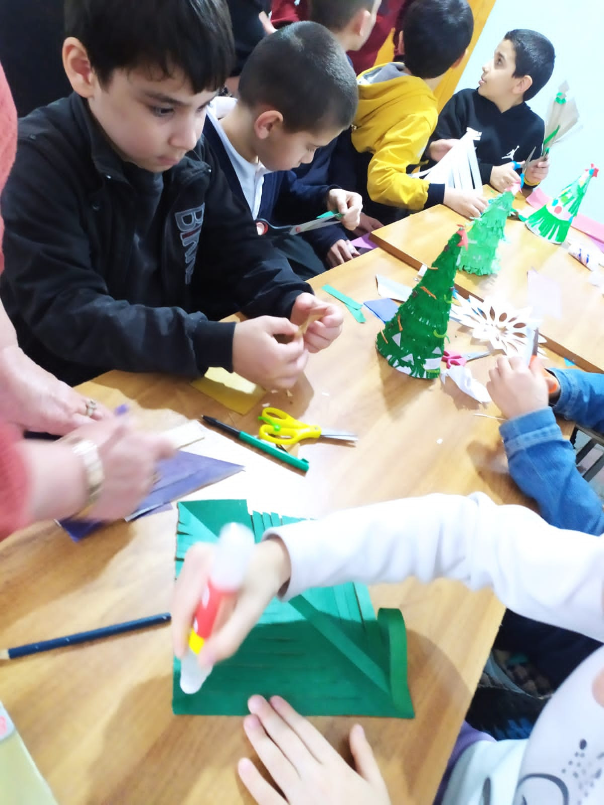 В ГБУ РД КЦСОН в МО «Кайтагский район» в отделении временного пребывания детей и семей с детьми провели занятия по изготовлению Новогодней елочки и снежинок из цветной бумаги. Цель занятия: Знакомство с историей и символикой Новогодней елочки традиционными атрибутами, изготовление елочки и снежинок из цветной бумаги. Задачи: Формировать интерес у детей к художественному ручному труду; Развивать ручную умелость, мелкую моторику рук; Воспитывать трудолюбие, аккуратность, желание доводить начатое дело до конца; Расширять знания детей о новогоднем празднике, создавать атмосферу праздничного настроения, желание доставлять радость близким. Выявить имеющие у детей знания о Новогодней елке. Перед выполнением работы детям показали образцы иллюстрации, презентации, выполнение последовательности работы, использование схем. Новый год – самый любимый, чудесный праздник с волшебными превращениями и подарками Деда Мороза. Делать поделки своими руками на Новый год интересно, особенно если есть под рукой разнообразные материалы для творчества. Сегодня на занятии мы изготовили новогодние елки и снежинки. Дети самостоятельно выполняют работу. Теперь Вы, Дети сами сможете сделать их своими руками.