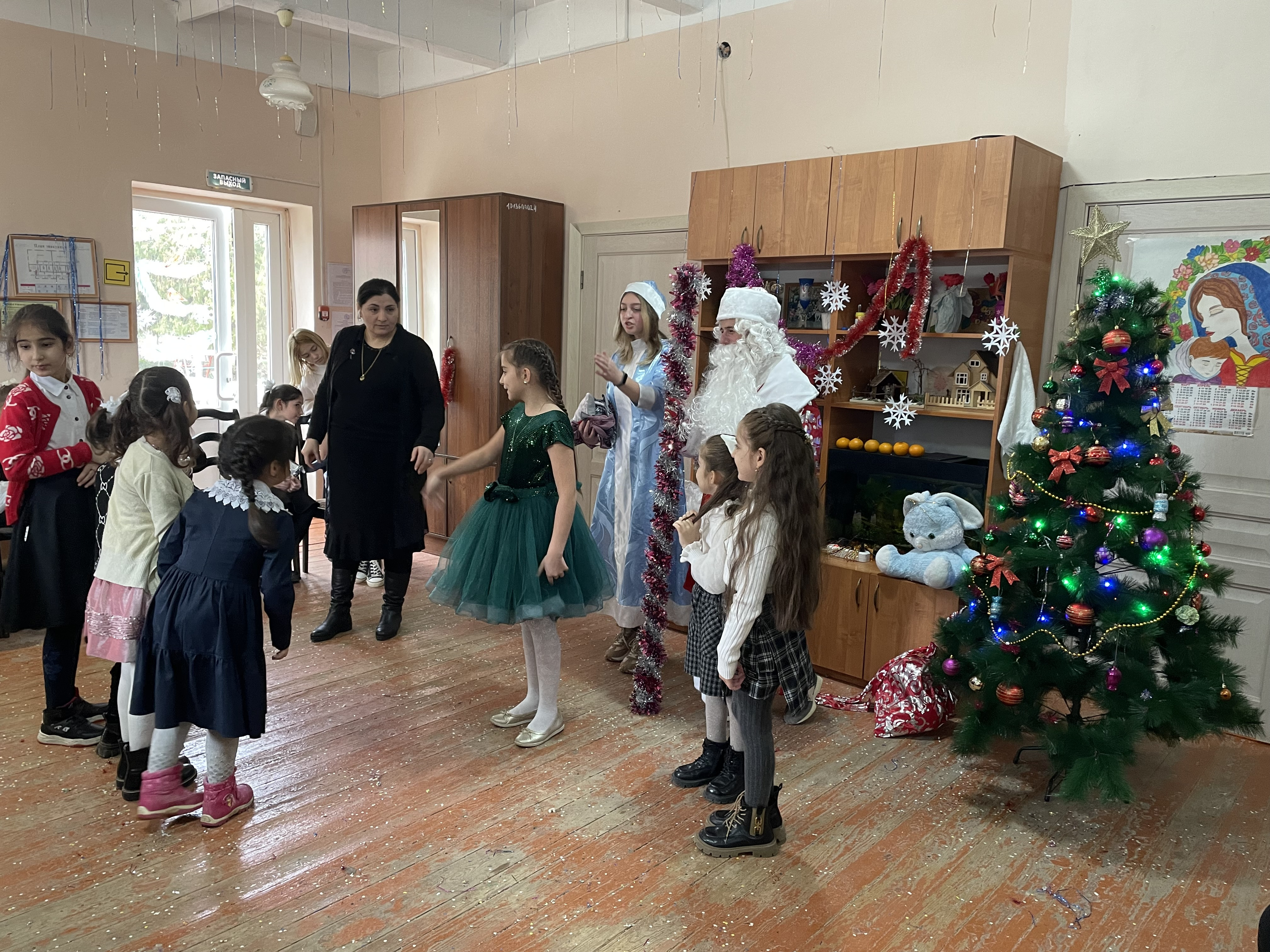 Поздравить ребят с наступающим Новым годом пришли Дед Мороз со Снегуркой. Дети рассказали стихи, спели песенки и конечно же водили хоровод. Так же были различные игры и конкурсы в которых дети проявили свою ловкость и сообразительность. Каждому ребёнку Дед Мороз вручил сладкий подарок.