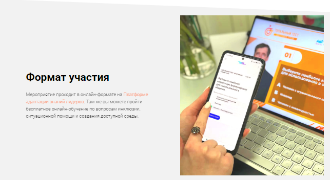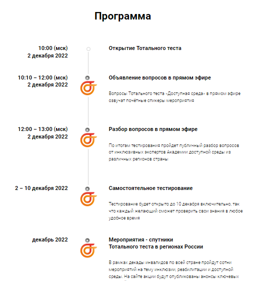 Со 2 по 10 декабря 2022 года каждый житель России сможет проверить свои знания по вопросам ситуационной помощи, этики общения и создания доступной среды для людей с инвалидностью. Общероссийская акция Тотальный тест «Доступная среда» приурочена к Международному дню инвалидов и направлена на привлечение внимания россиян к правам и потребностям людей с инвалидностью. Тестирование традиционно проводится в онлайн-формате. Также по итогам мероприятия пройдёт публичный разбор вопросов и тренинг с участием ведущих экспертов. Участники мероприятия также получат возможность подготовиться к тестированию и бесплатно пройти обучающие курсы от ведущих российских экспертов в области доступной среды, инклюзии и создания доступных цифровых сервисов для людей с инвалидностью.