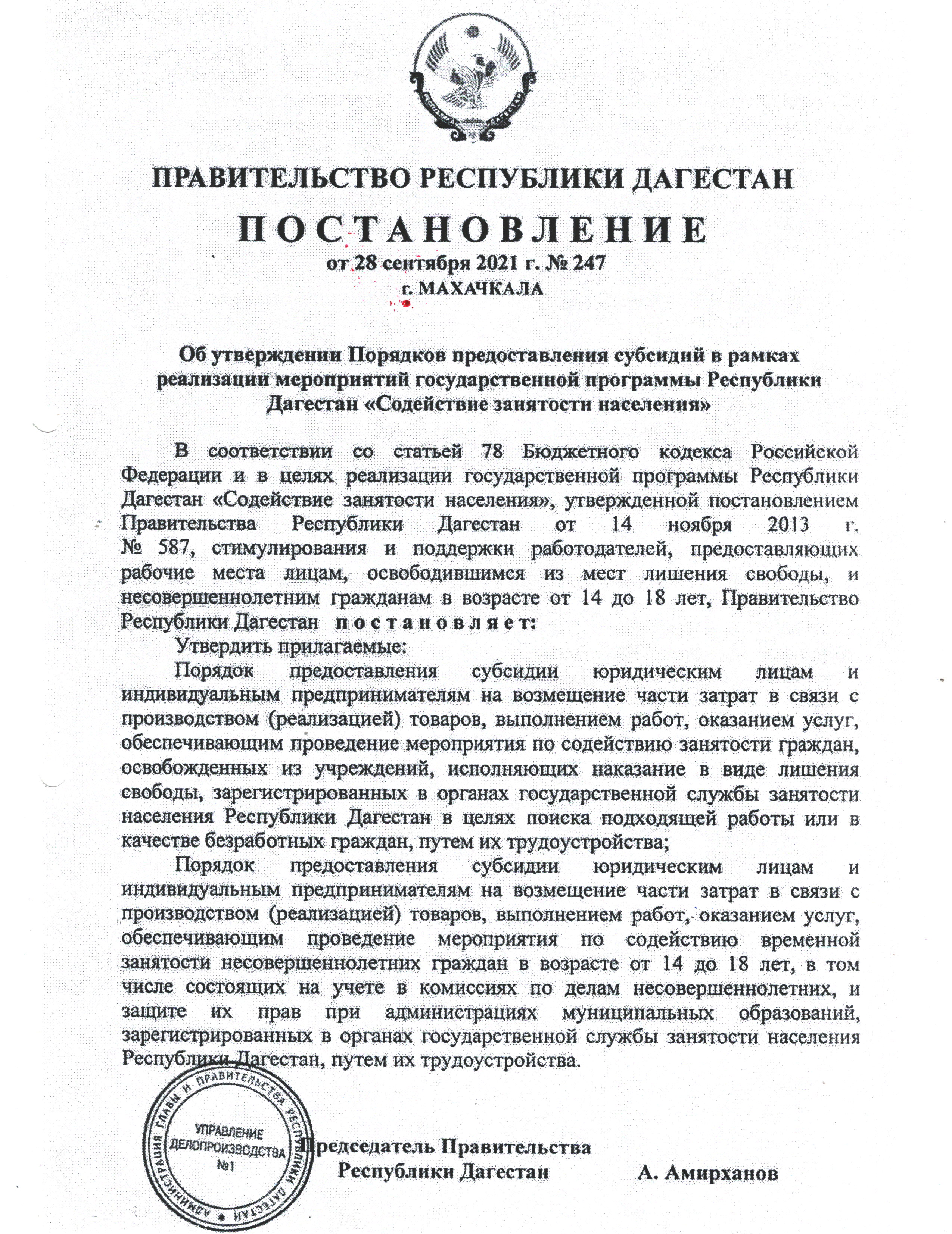 1.1. Настоящее объявление подготовлено в целях продлении в 2024 году Центром занятости отбора для получения юридическими лицами и индивидуальными предпринимателями из республиканского бюджета Республики Дагестан субсидии на возмещение части затрат в связи с производством (реализацией) товаров, выполнением работ, оказанием услуг, обеспечивающим проведение мероприятия по содействию временной занятости несовершеннолетних граждан в возрасте от 14 до 18 лет, и заключения соглашений между Центрами занятости и юридическими лицами и индивидуальными предпринимателями о предоставлении субсидии, в соответствии с Порядком предоставления субсидии юридическим лицам и индивидуальным предпринимателям на возмещение части затрат в связи с производством (реализацией) товаров, выполнением работ, оказанием услуг, обеспечивающим проведение мероприятия по содействию временной занятости несовершеннолетних граждан в возрасте от 14 до 18 лет, в том числе состоящих на учете в комиссиях по делам несовершеннолетних, и защите их прав при администрациях муниципальных образований, зарегистрированных в органах государственной службы занятости населения Республики Дагестан, путем их трудоустройства, утвержденным постановлением Правительства Республики Дагестан от 28 сентября 2021 г. № 247 (В редакции Постановления Правительства РД от 05.10.2023 № 397) «Об утверждении Порядков предоставления субсидий в рамках реализации мероприятий государственной программы Республики Дагестан «Содействие занятости населения» (далее – отбор, объявление, субсидия, Порядок).