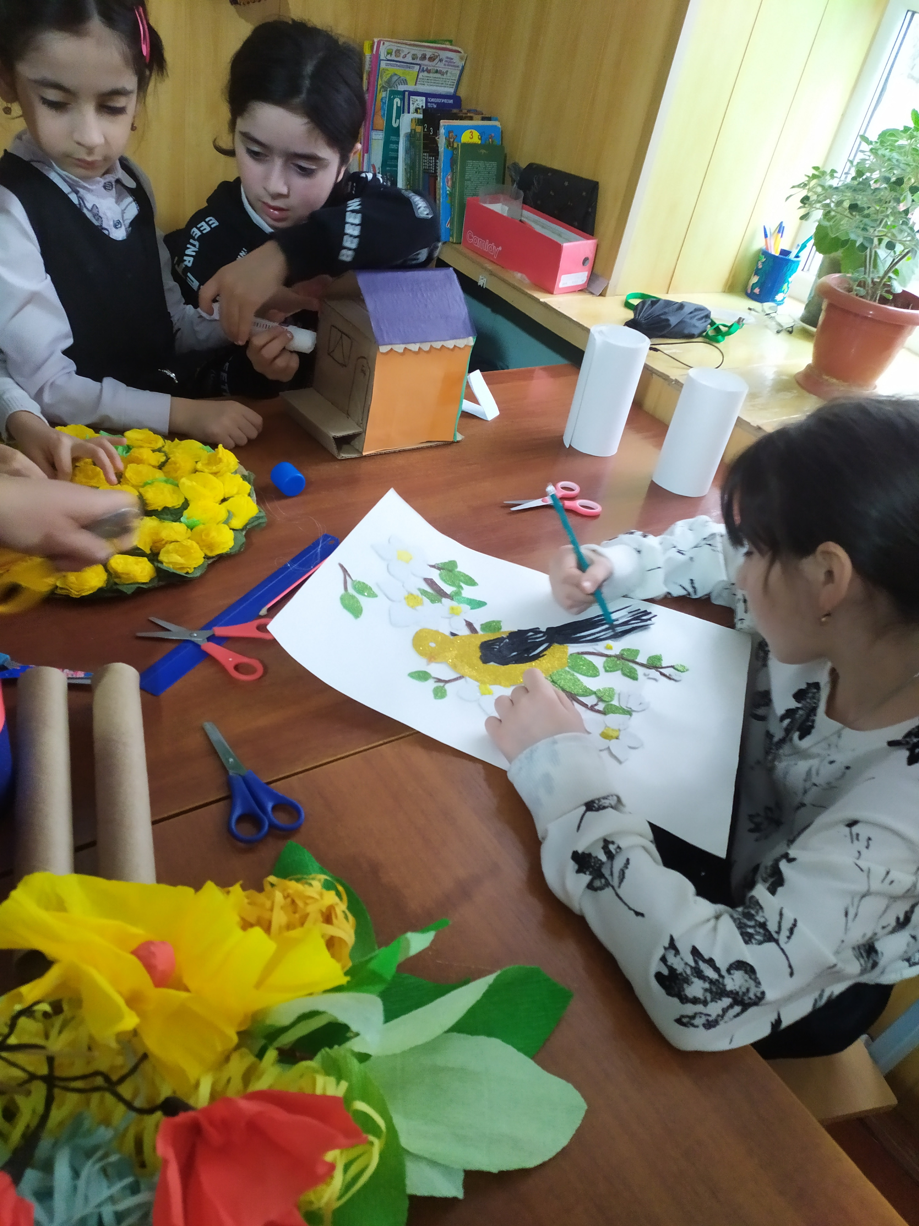Оборудование: цветной картон, фоамиран цветной, клей, ножницы, кисточки. Дети изготовили домик из картона, дерево из бумажных салфеток, птицу из фоамирана, вазу с цветами из цветной бумаги. Они с большим удовольствием и радостью выполняли поделки.