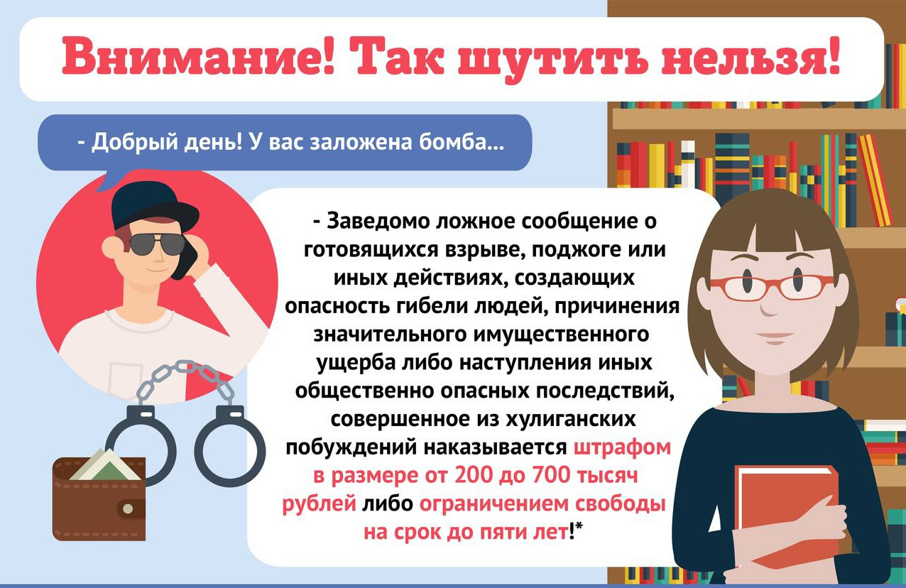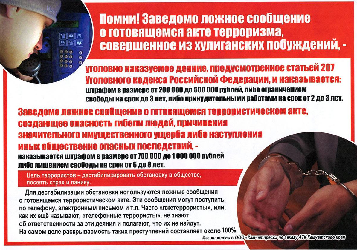 Данная памятка поможет Вам ознакомиться с основными нормами законодательства РФ, предусматривающими ответственность за заведомо ложное сообщение об акте терроризма,участие и пособничество в противоправной деятельности, в том числе связанной с наемничеством и терроризмом. Обращаем Ваше внимание на недопустимость нарушения Российских законов! Будьте бдительны и осторожны.