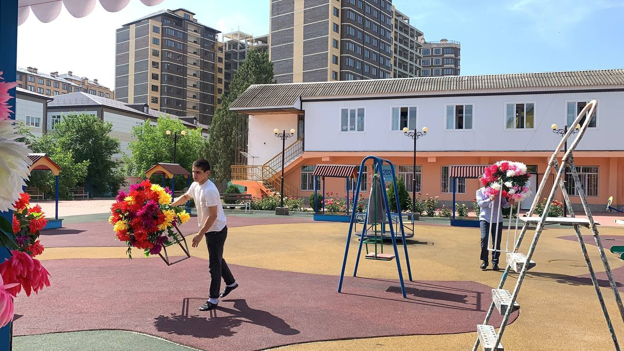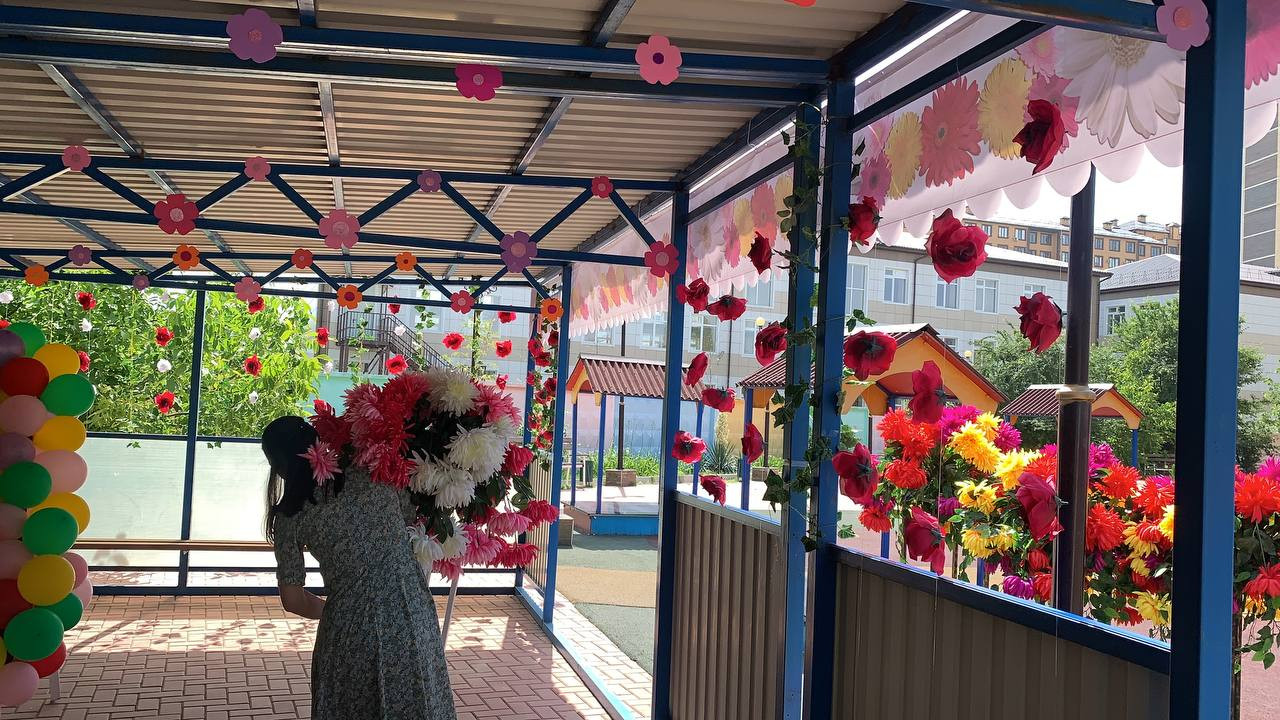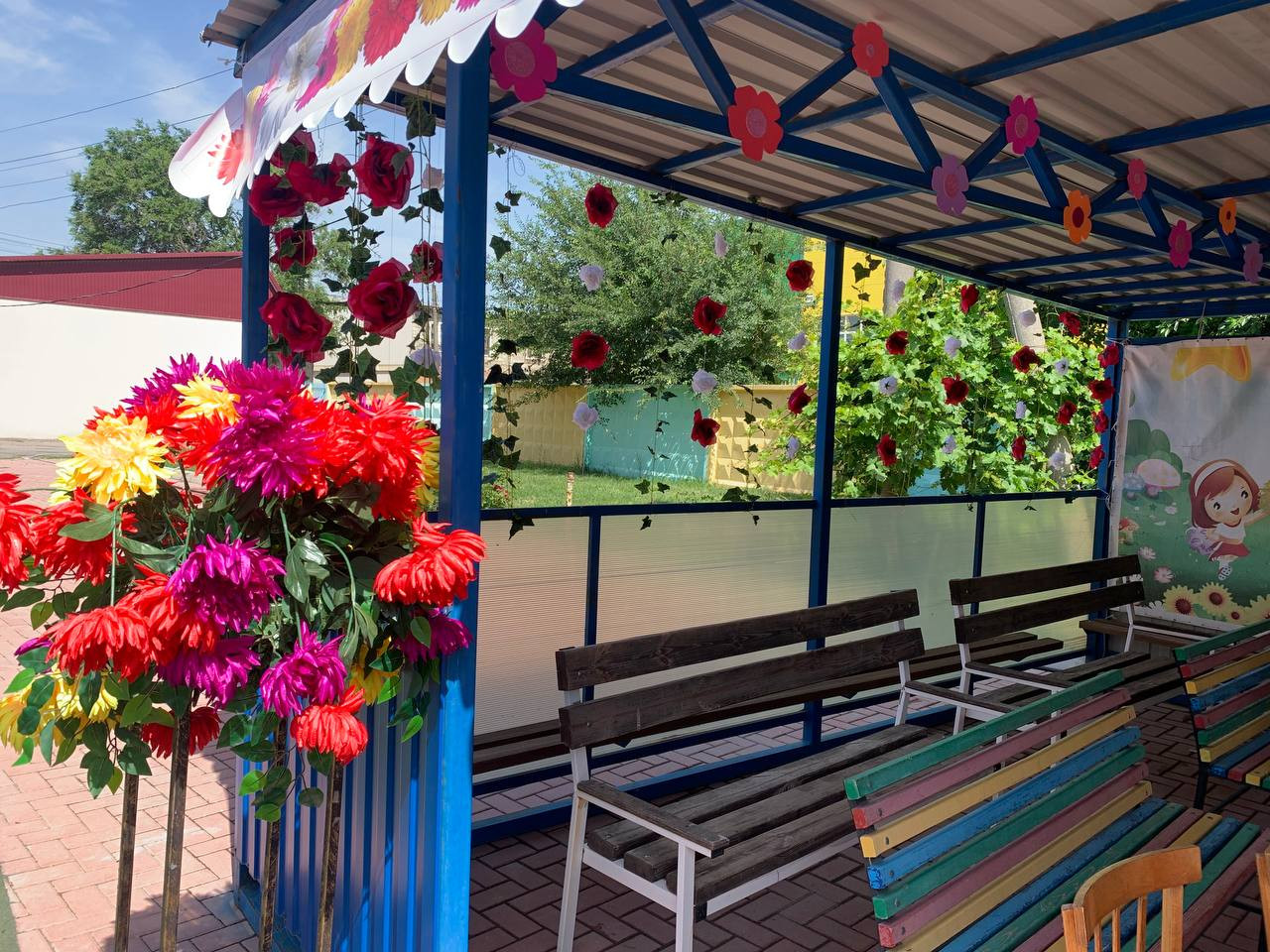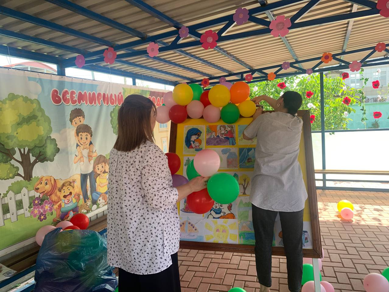 Праздник будет проходить во дворе центра, где будет организована выставка детских работ. Детская беседка оформлена праздничными баннерами, цветами и шарами.