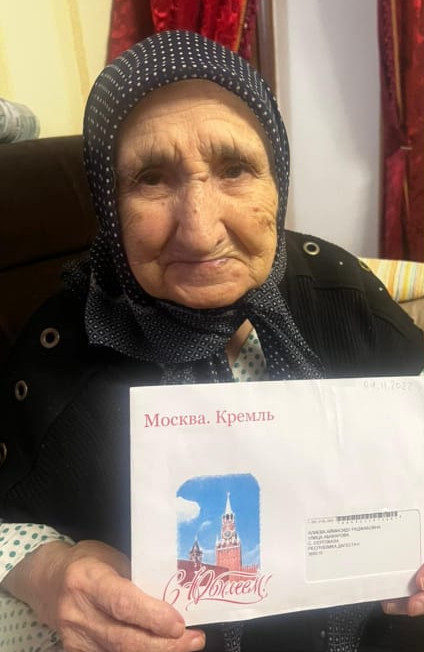 Ведущий специалист ГКУ РД "УСЗН в МО " Сергокалинского района" Абакаров Магомед- Сайгид Расулович совместно с председателем совета ветеранов района и специалистом КЦСОН вручили открытку с персональное поздравления Президента Российской Федерации В. В. Путина вдове инвалида В.О.В Алиевой Аймисиду Раджабовне проживающей с. Сергокала. Юбилей у которой состоялся 04.11.2022г.