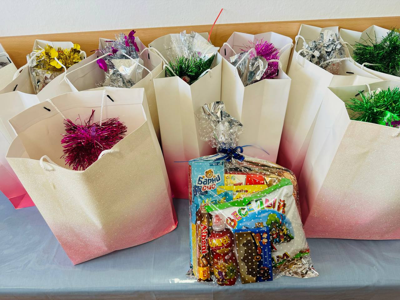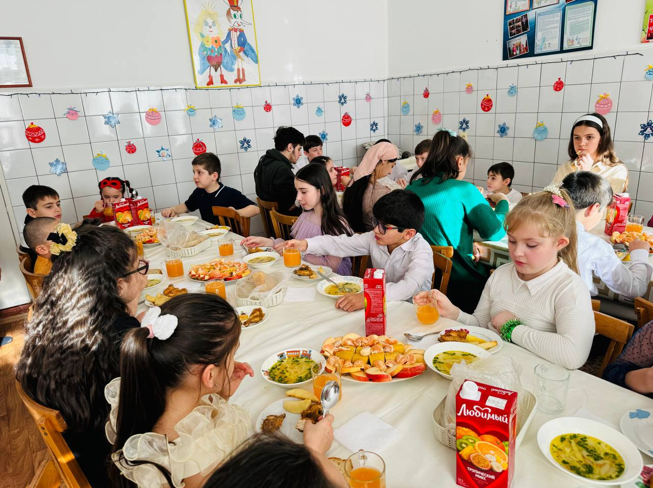 Они провели с детьми музыкальные игры и розыгрыши, подарили детям радость и хорошее настроение. Для детей был накрыт праздничный стол от постоянного спонсора.