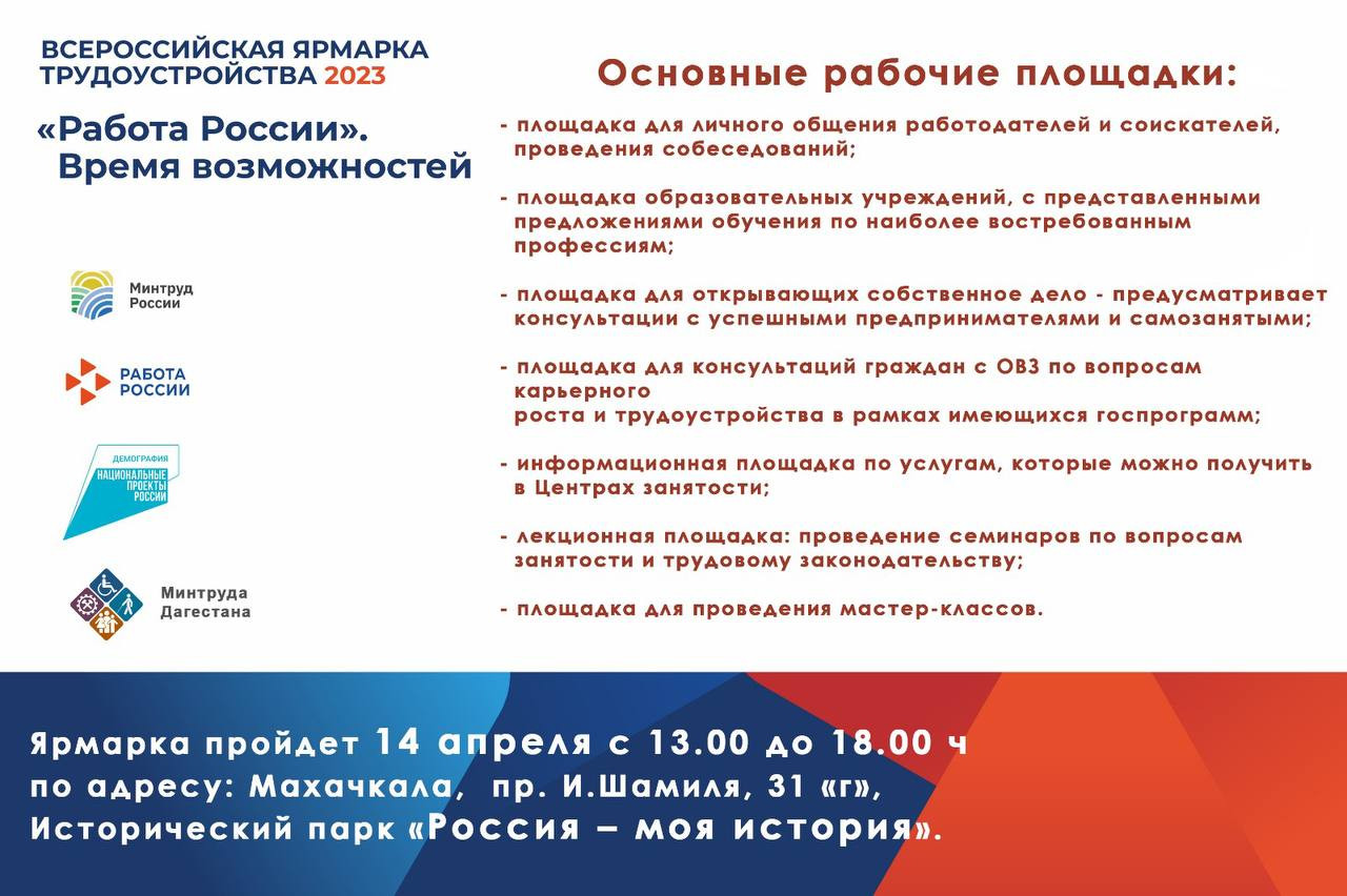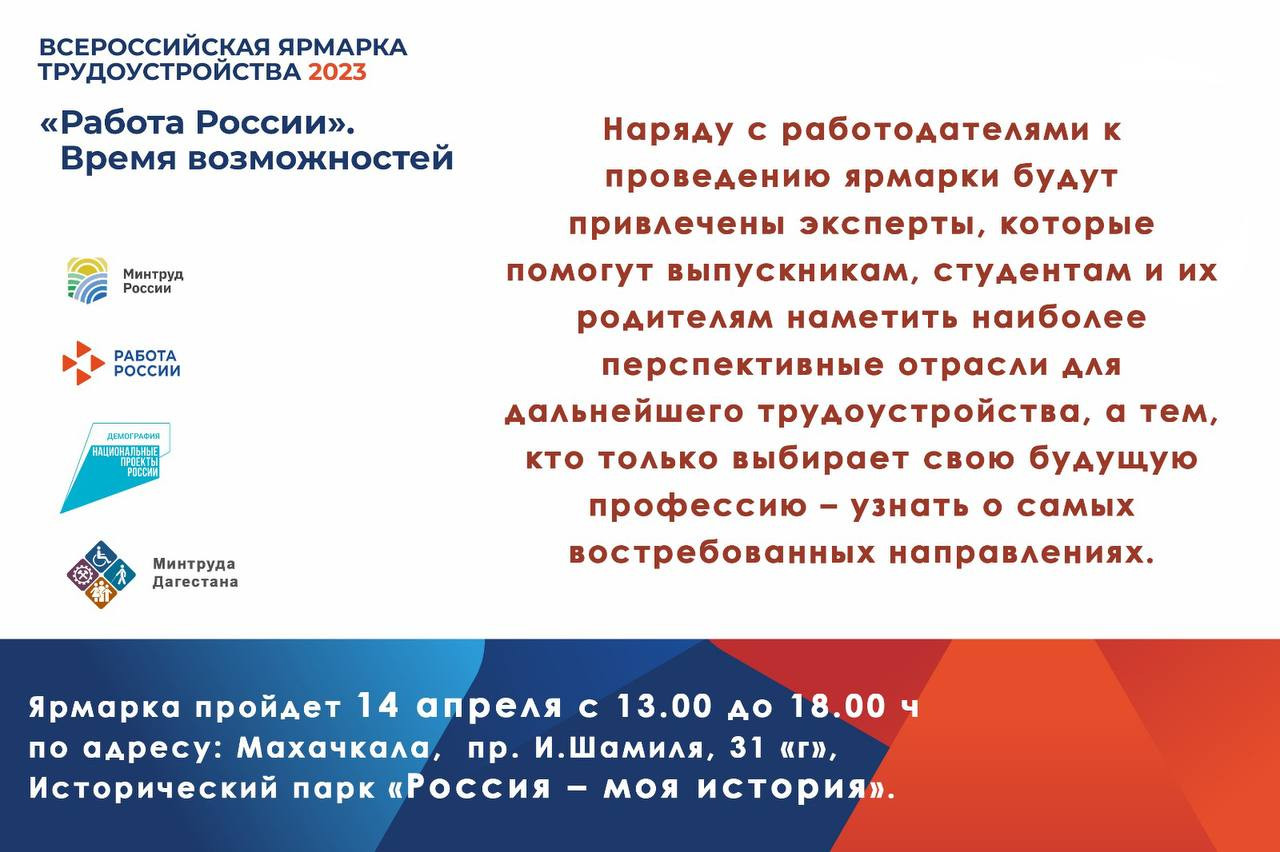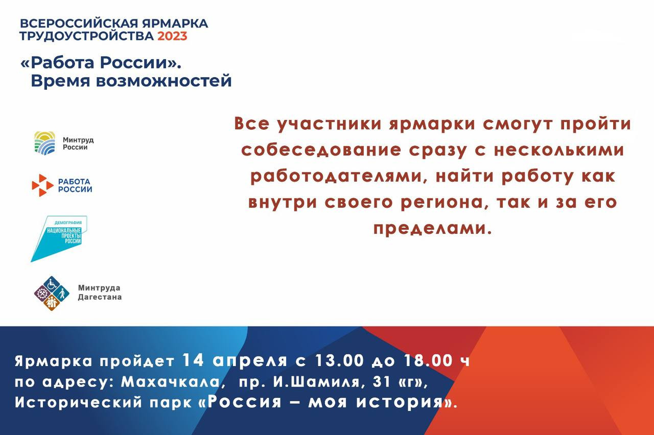 ?Первый этап Всероссийской ярмарки трудоустройства «Работа России. Время возможностей» состоится 14 апреля в Дагестане. Ярмарка пройдет с 13:00 до 18:00 в историческом парке «Россия – моя история» в Махачкале.