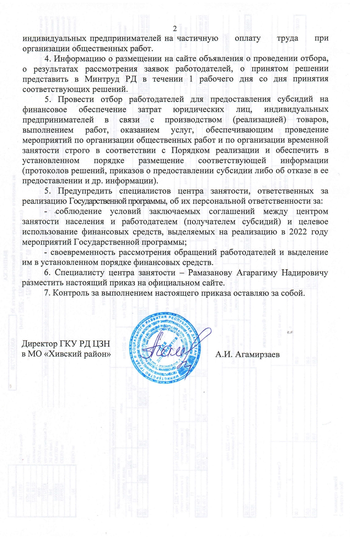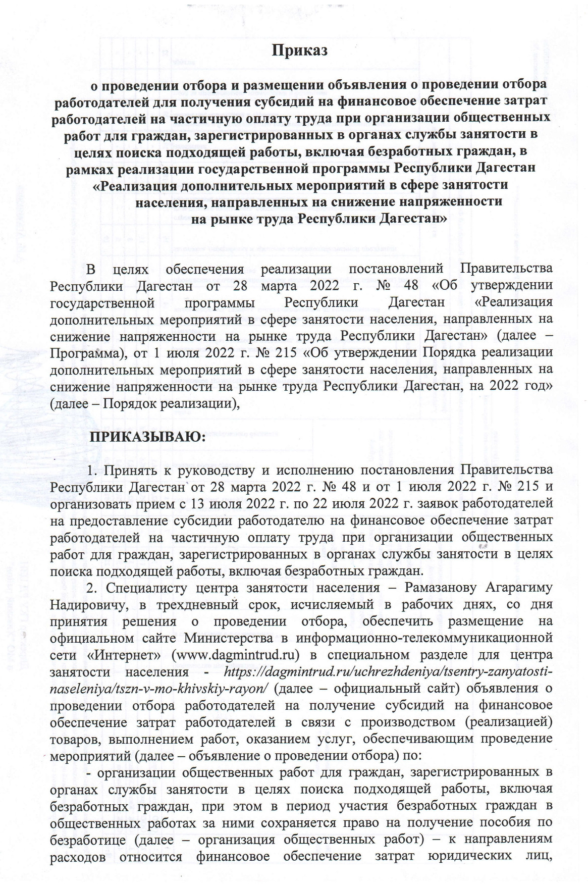 Приказ о проведении отбора и размещении объявления о проведении отбора работодателей для получения субсидий на финансовое обеспечение затрат работодателей на частичную оплату труда при организации общественных работ для граждан, зарегистрированных в органах службы занятости в целях поиска подходящей работы, включая безработных граждан, в рамках реализации государственной программы Республики Дагестан «Реализация дополнительных мероприятий в сфере занятости населения, направленных на снижение напряженности на рынке труда Республики Дагестан» В целях обеспечения реализации постановлений Правительства Республики Дагестан от 28 марта 2022 г. № 48 «Об утверждении государственной программы Республики Дагестан «Реализация дополнительных мероприятий в сфере занятости населения, направленных на снижение напряженности на рынке труда Республики Дагестан» (далее – Программа), от 1 июля 2022 г. № 215 «Об утверждении Порядка реализации дополнительных мероприятий в сфере занятости населения, направленных на снижение напряженности на рынке труда Республики Дагестан, на 2022 год» (далее – Порядок реализации), ПРИКАЗЫВАЮ: 1. Принять к руководству и исполнению постановления Правительства Республики Дагестан от 28 марта 2022 г. № 48 и от 1 июля 2022 г. № 215 и организовать прием с 13 июля 2022 г. по 22 июля 2022 г. заявок работодателей на предоставление субсидии работодателю на финансовое обеспечение затрат работодателей на частичную оплату труда при организации общественных работ для граждан, зарегистрированных в органах службы занятости в целях поиска подходящей работы, включая безработных граждан. 2. Специалисту центра занятости населения – Рамазанову Агарагиму Надировичу, в трехдневный срок, исчисляемый в рабочих днях, со дня принятия решения о проведении отбора, обеспечить размещение на официальном сайте Министерства в информационно-телекоммуникационной сети «Интернет» (www.dagmintrud.ru) в специальном разделе для центра занятости населения - https://dagmintrud.ru/uchrezhdeniya/tsentry-zanyatosti-naseleniya/tszn-v-mo-khivskiy-rayon/ (далее – официальный сайт) объявления о проведении отбора работодателей на получение субсидий на финансовое обеспечение затрат работодателей в связи с производством (реализацией) товаров, выполнением работ, оказанием услуг, обеспечивающим проведение мероприятий (далее – объявление о проведении отбора) по: - организации общественных работ для граждан, зарегистрированных в органах службы занятости в целях поиска подходящей работы, включая безработных граждан, при этом в период участия безработных граждан в общественных работах за ними сохраняется право на получение пособия по безработице (далее – организация общественных работ) – к направлениям расходов относится финансовое обеспечение затрат юридических лиц, индивидуальных предпринимателей на частичную оплату труда при организации общественных работ. 4. Информацию о размещении на сайте объявления о проведении отбора, о результатах рассмотрения заявок работодателей, о принятом решении представить в Минтруд РД в течении 1 рабочего дня со дня принятия соответствующих решений. 5. Провести отбор работодателей для предоставления субсидий на финансовое обеспечение затрат юридических лиц, индивидуальных предпринимателей в связи с производством (реализацией) товаров, выполнением работ, оказанием 